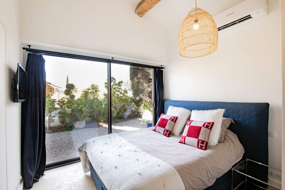 Une chambre est indépendante de la maison principale et nécessite de passer par l’extérieur pour rejoindre les pièces à vivre.