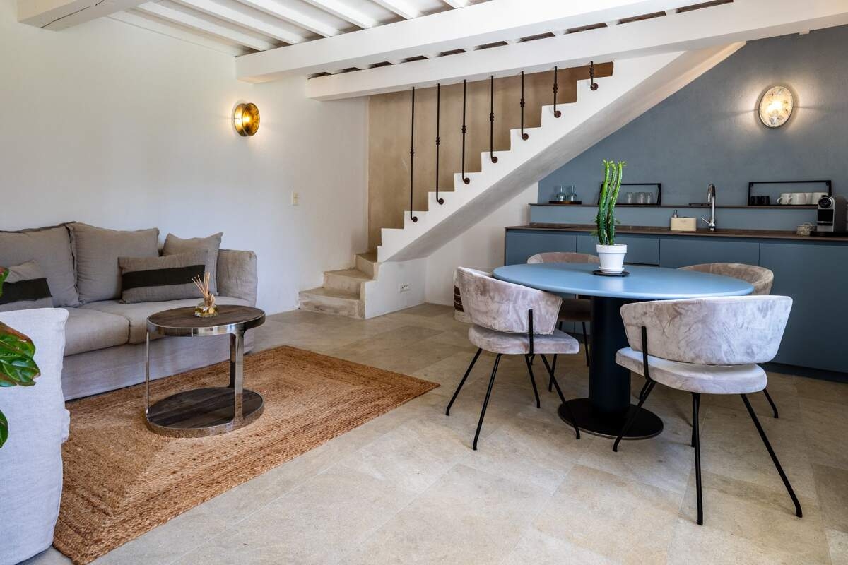 La maison dispose de quatre chambres dans le bâtiment principal. Quatre dépendances comprenant une ou deux chambres chacune, sont uniquement accessibles par l’extérieur.