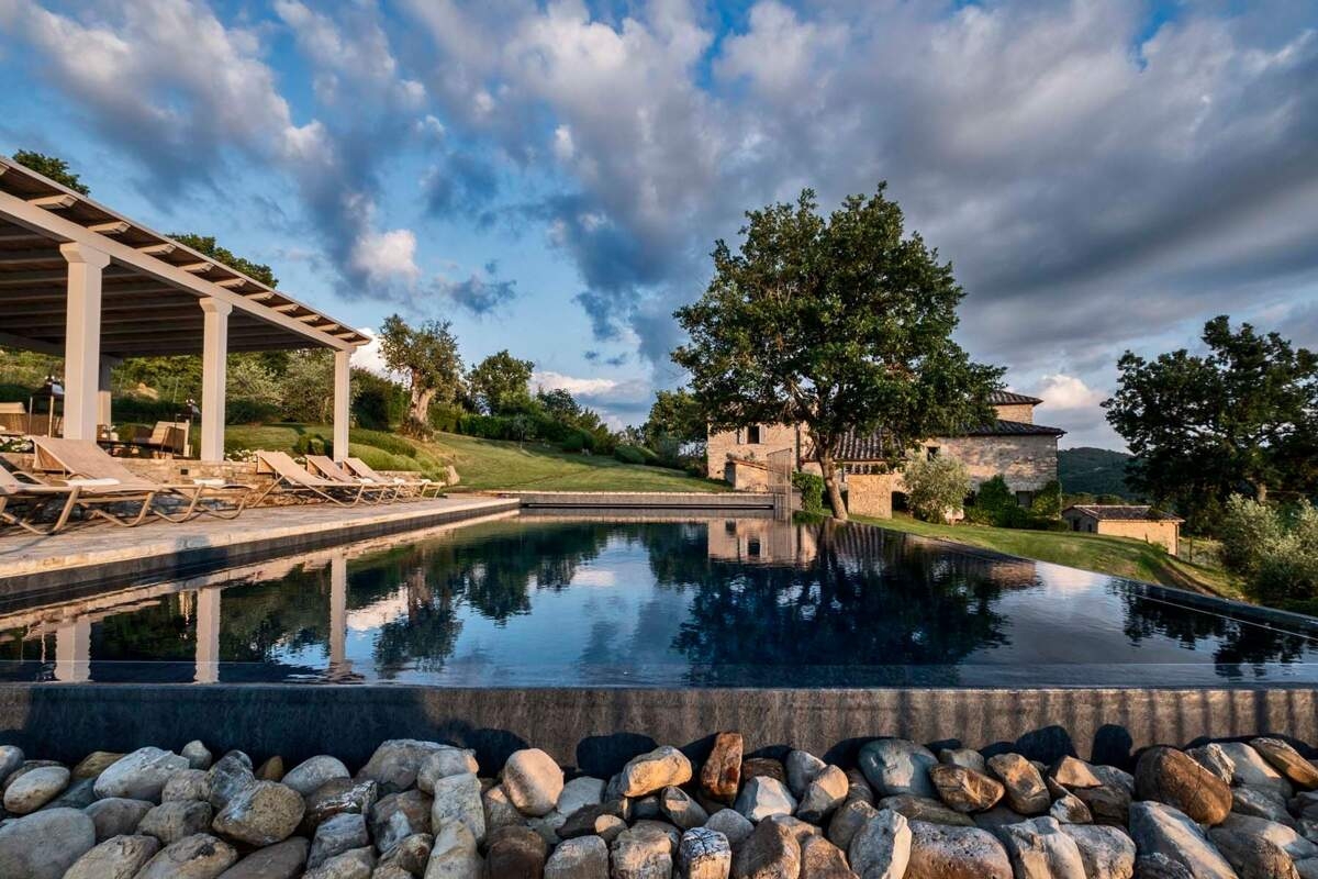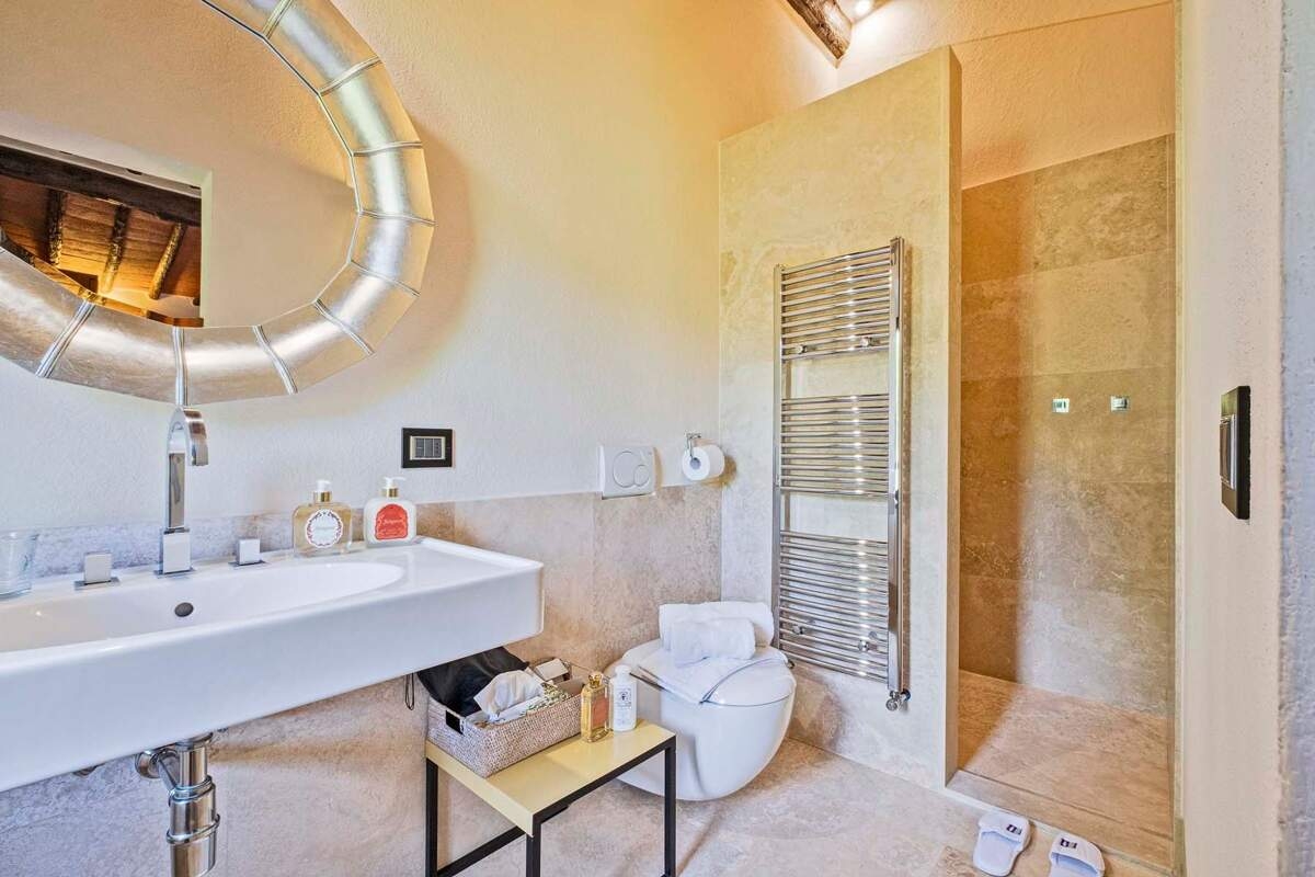 Derrière des chemins bordés d'oliviers et des collines couvertes de vignobles, la villa se dresse sur les pentes paisibles de l'arrière-pays toscan, observant les crêtes boisées qui se dirigent vers la Méditerranée. Cet environnement bucolique où les cyprès se mêlent aux murs en pierres sèches est sublimé par la noblesse de l'architecture, modèle même de la résidence princière de campagne de la fin du Moyen Âge. Le domaine a été conçu pour vivre en harmonie avec la nature : la pergola se métamorphose en belvédère ; les espaces communs extérieurs, bordés de pierres brutes, sont propices aux loisirs et aux arts. À l'intérieur, la charpente apparente et les murs en pierre prolongent le charme du domaine, mis en valeur à l'étage par un mobilier design. Dans les chambres, le luxe des équipements modernes se marie à l'atmosphère rustique de la villa, sous de larges poutres apparentes qui absorbent la lumière des paysages extérieurs. Ces espaces intimes sont dotés de salles de bains privatives qui expriment toute la beauté de la région, de la tradition séculaire à la vie contemporaine.