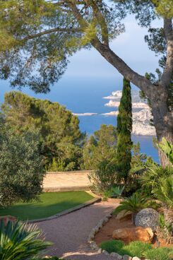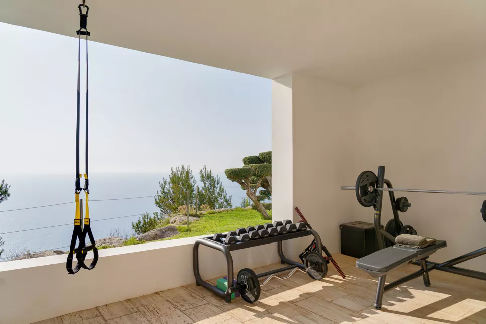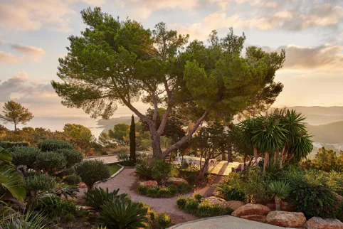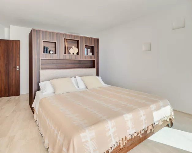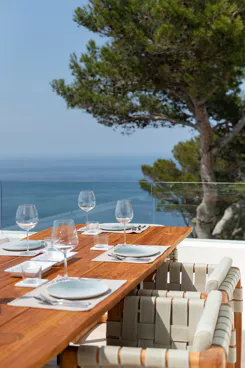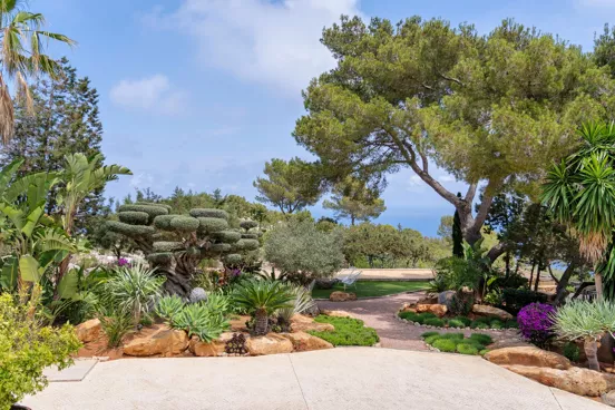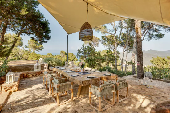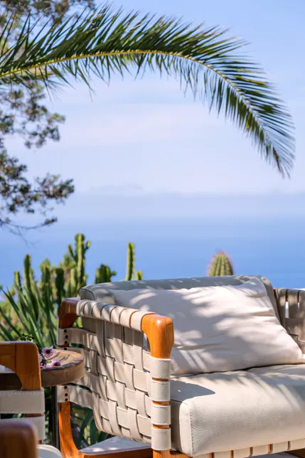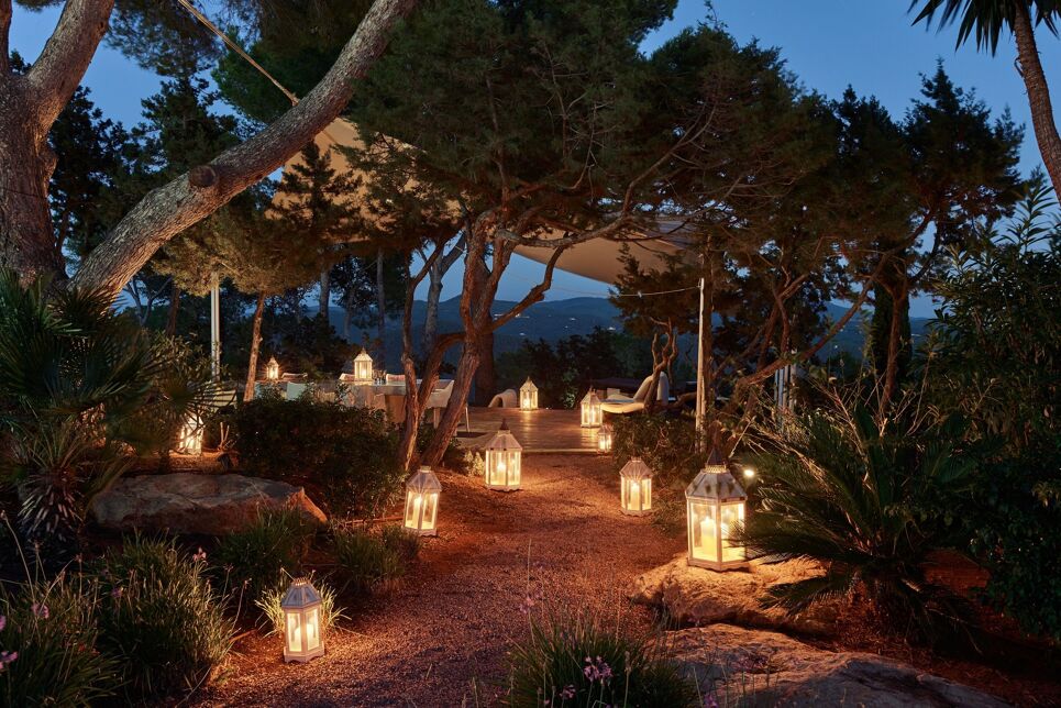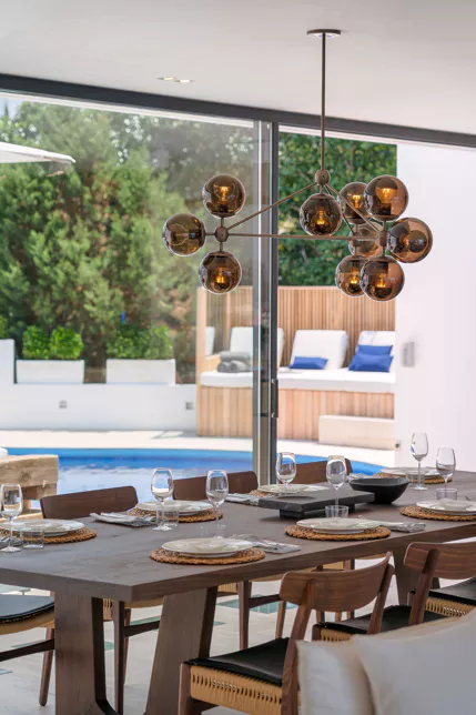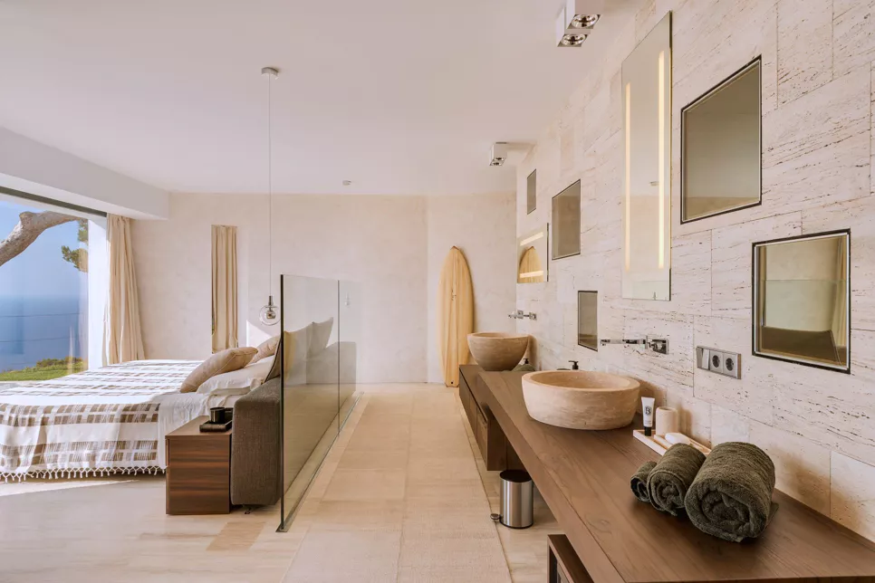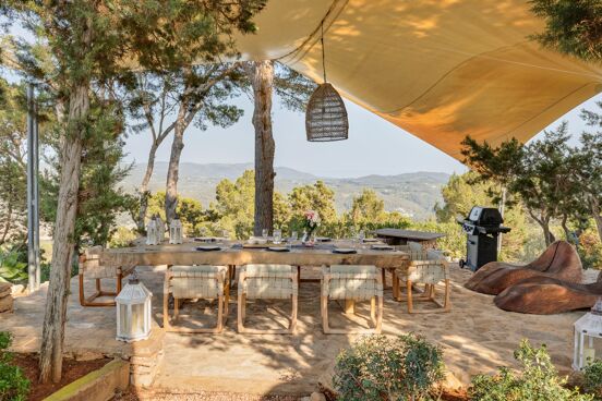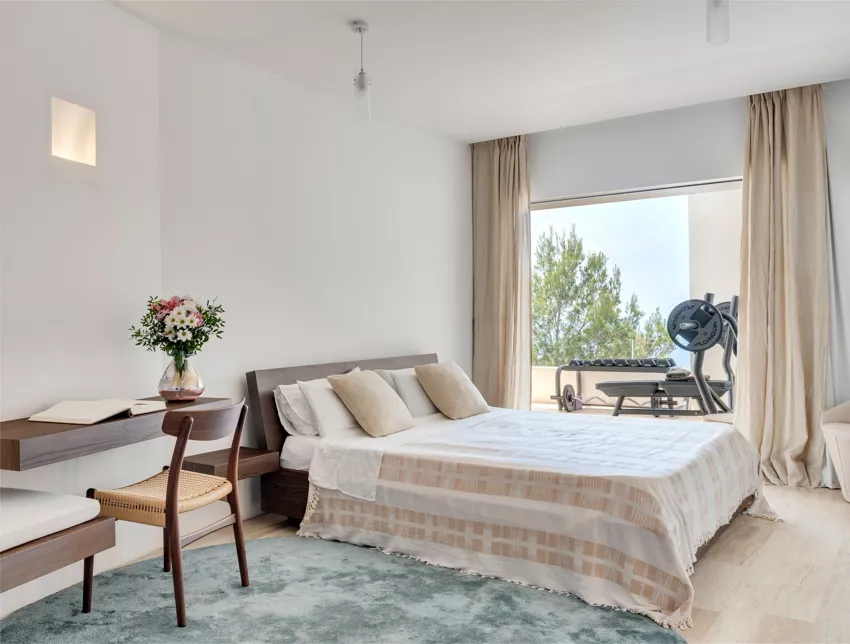 Dans l’une des chambres, un grand lit foncé trône au centre de la pièce, face aux baies vitrées. Des lampes modernes transparentes complètent le style, tandis que le reste de la décoration s’inspire de la nature avec des tableaux bleu marine, des orchidées et un petit palmier – pour une touche résolument contemporaine. Depuis la véranda, admirez la vue panoramique sur la mer, les montagnes et la campagne environnante. Aux heures les plus chaudes, rafraîchissez-vous dans la piscine, à l’ombre de la végétation luxuriante. Pour l’un des plus beaux couchers de soleil d’Ibiza, rendez-vous à Cala Benirrás et laissez-vous émerveiller par les rayons dorés qui disparaissent derrière les falaises. Terminez la journée à la Villa Blue avec un délicieux dîner préparé par votre chef privé.