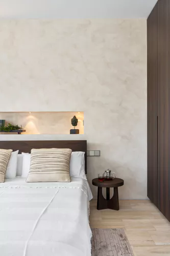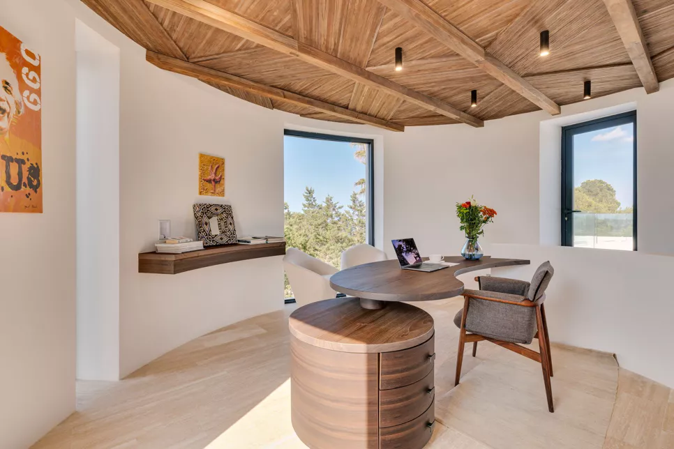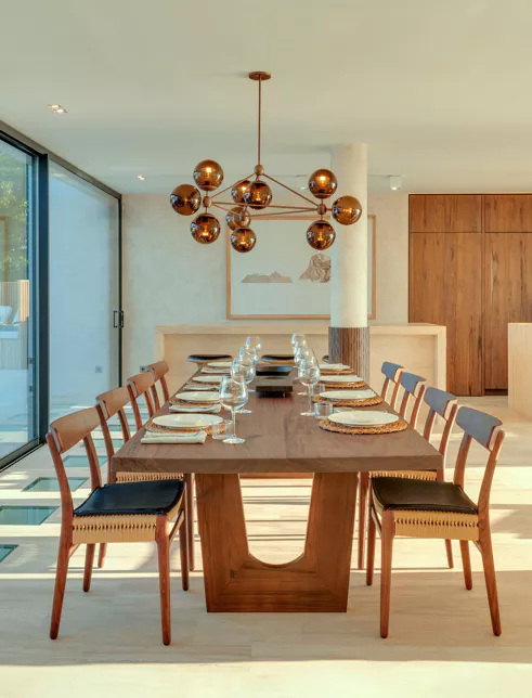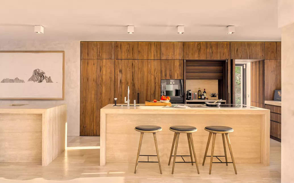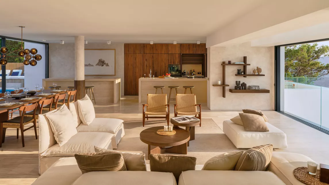 La Villa Blue est entourée d’un magnifique jardin méditerranéen planté de pins et de cyprès, qui mettent en valeur la blancheur éclatante et les lignes épurées de la maison. À l’intérieur, des tons crème apportent une ambiance douce et apaisante. Cette palette discrète s’accorde parfaitement avec les teintes beiges du bar américain et le mur noir qui le surplombe. Le mobilier, à la fois simple et élégant, crée une belle fluidité dans les espaces.