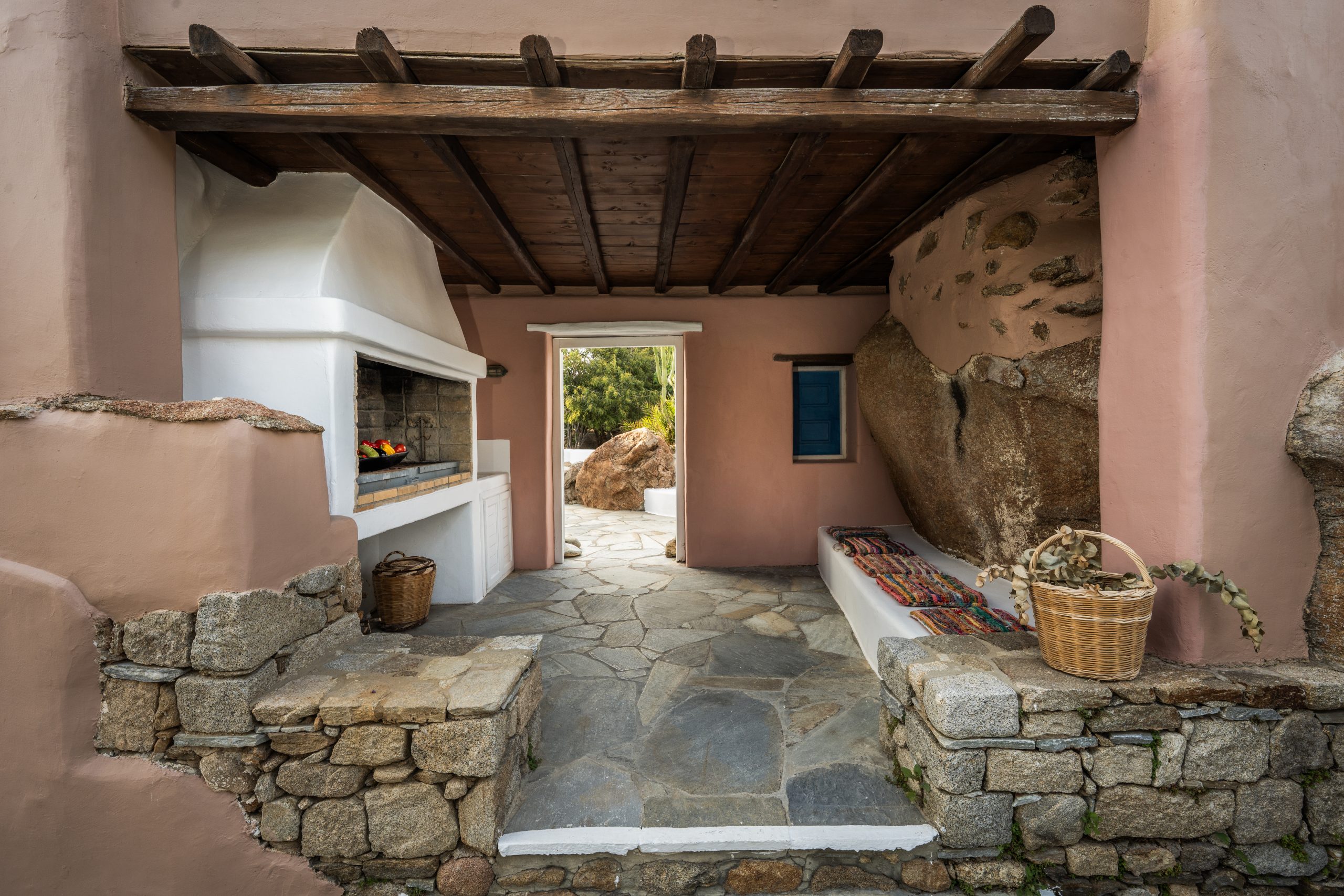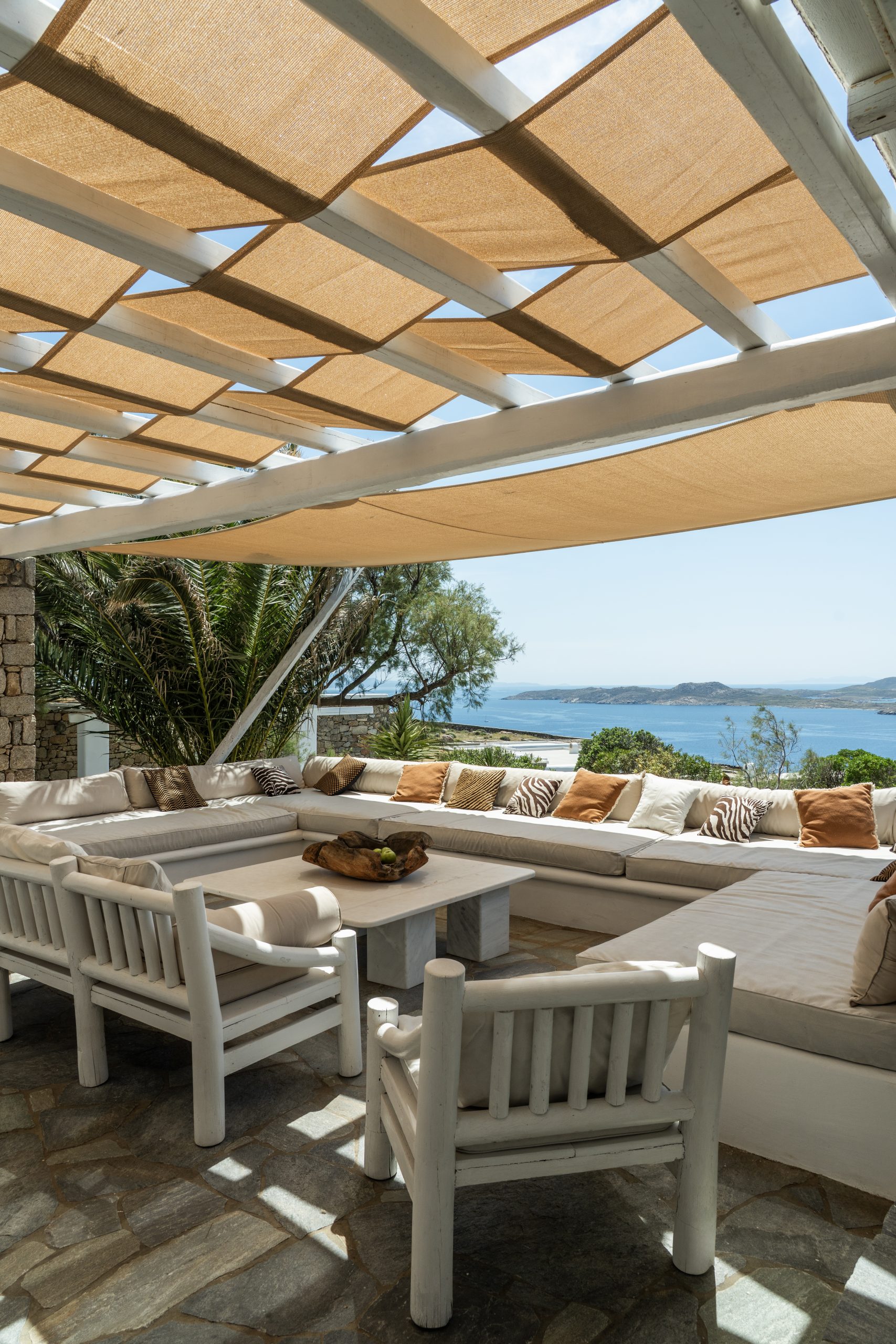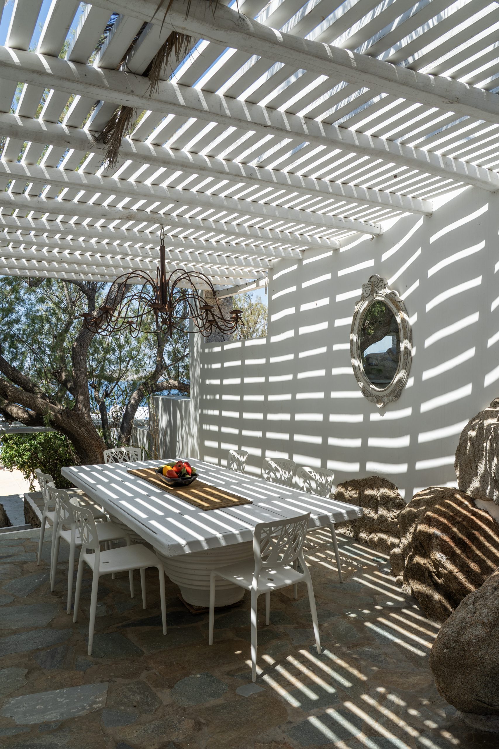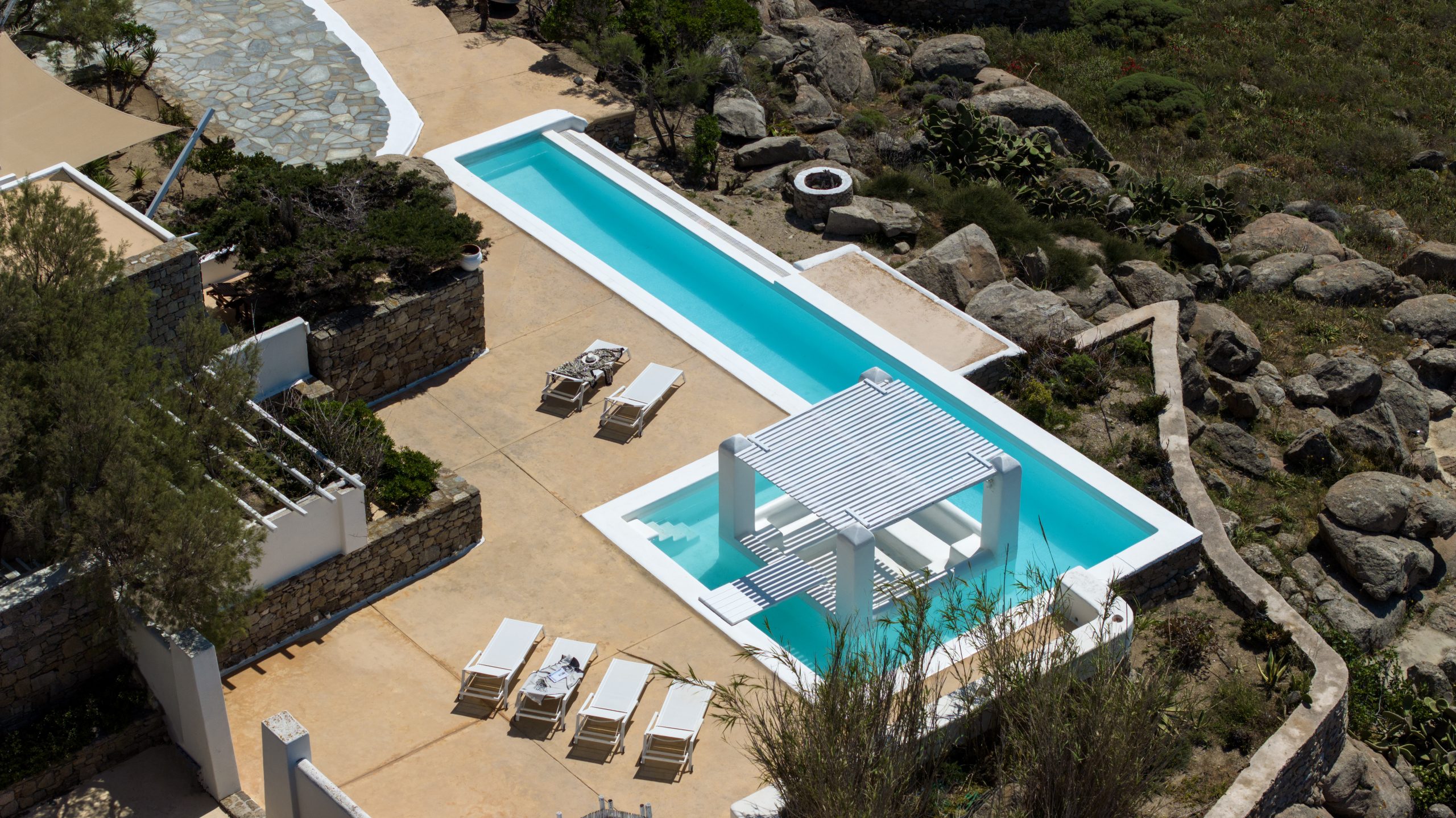 La villa équilibre les meilleures qualités du passé et du présent avec le respect des anciens bâtisseurs cycladiques pour les contraintes de la nature, créant un environnement unique : murs blancs étincelants, chambres charmantes avec leurs propres bains et terrasses, terrasses pittoresques et plantations entourant la maison qui reflètent la direction du vent. Des tentes accueillantes et des pergolas protègent les pluies d’hiver pour une utilisation ultérieure. Bien que la maison soit principalement occupée en été, sa forme vernaculaire, qui respecte les strictes lois locales de construction, rend la vie à Mykonos fascinante et toute l’année. La quincaillerie, le mobilier et les accessoires ont été sélectionnés dans un esprit rien de moins, issus des meilleures sources disponibles dans le monde entier. Le mobilier de salon extérieur, par exemple, vient du Mexique et le mobilier d’intérieur est l’œuvre collective de nombreux endroits dans le monde. Les tapis, lampes et menuiseries sont des produits du Maroc, la ferronnerie vient de Tunisie, et les portes représentent l’artisanat de l’Inde et de l’Arabie saoudite. La piscine, longue de 20 m sur 2,5 m de large, est construite au sommet d’une colline rocheuse adjacente à un salon de salle sous une tente. Le design unique met en valeur l’aménagement paysager de la maison.
