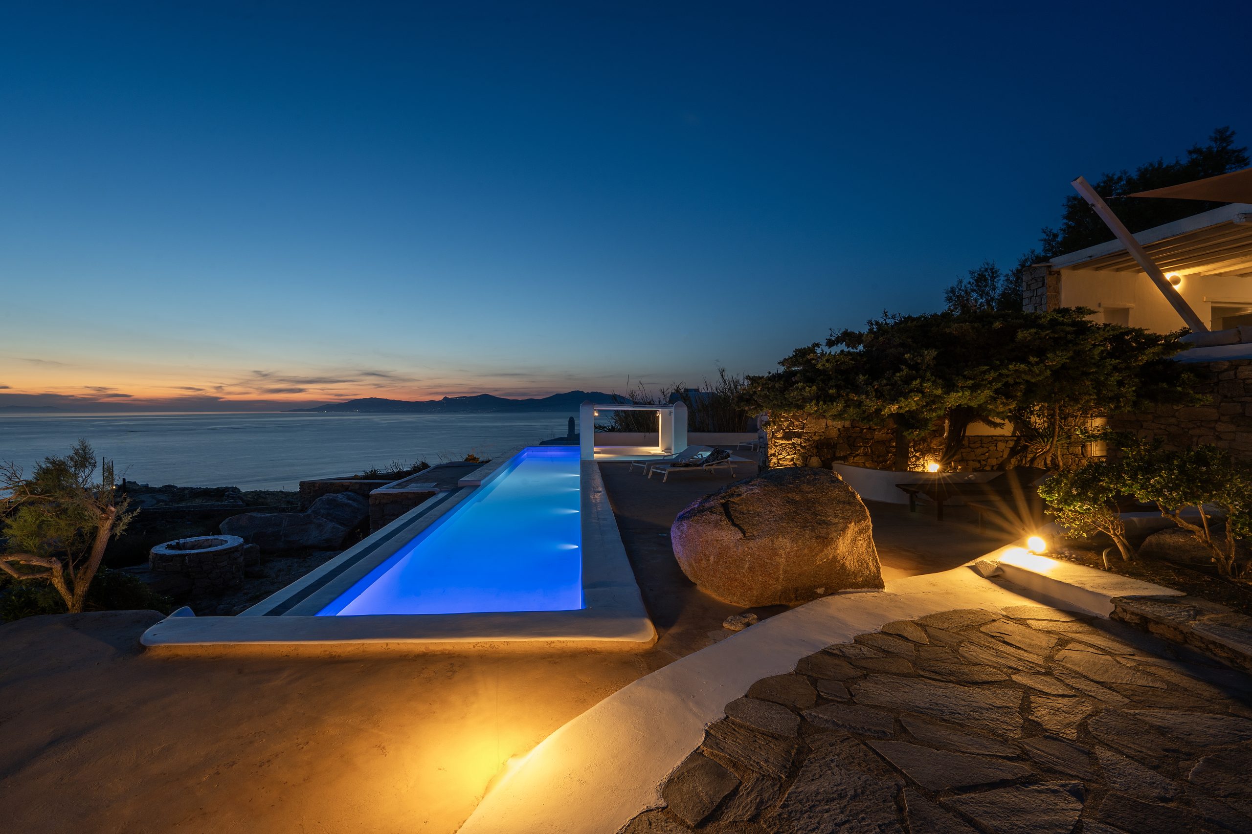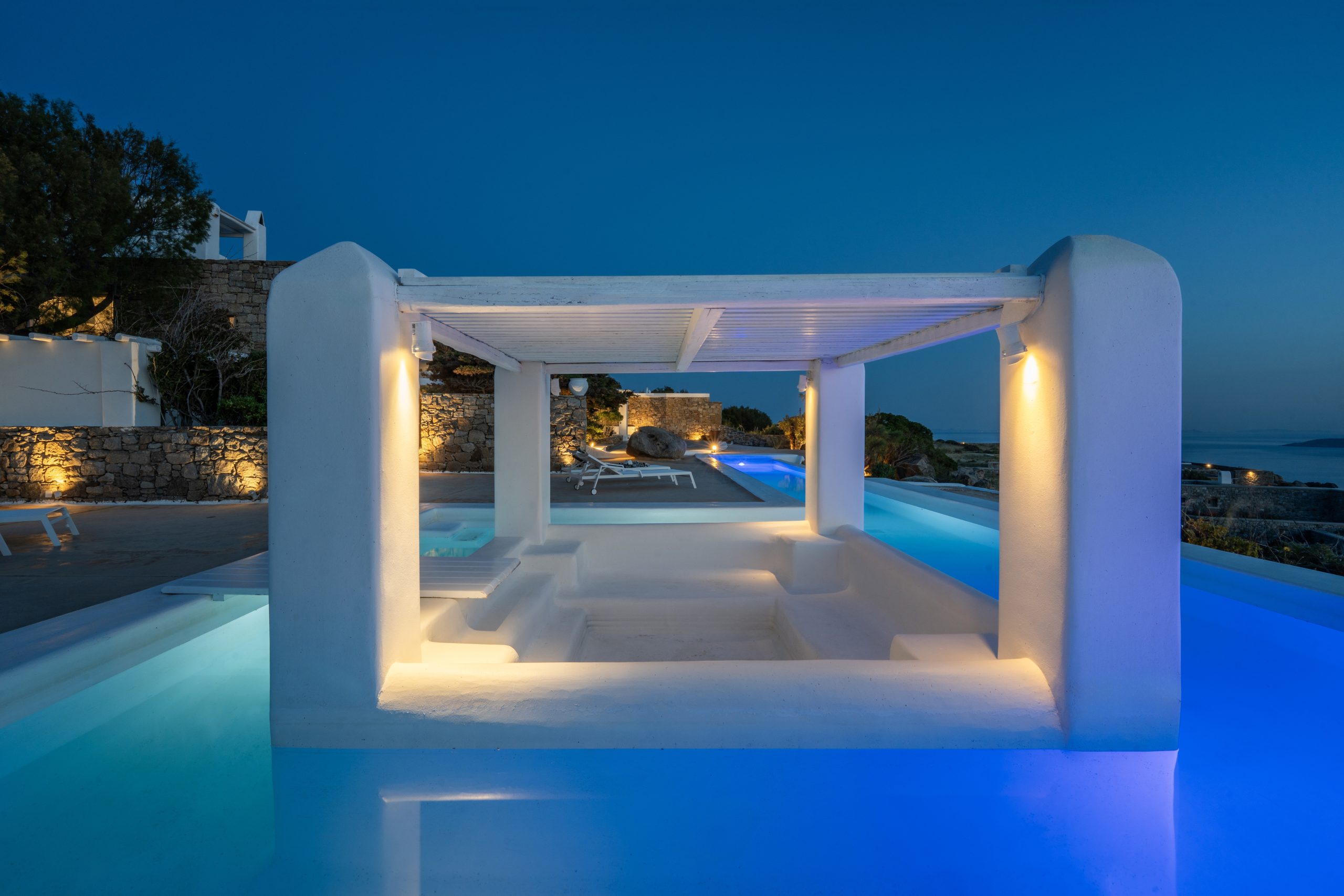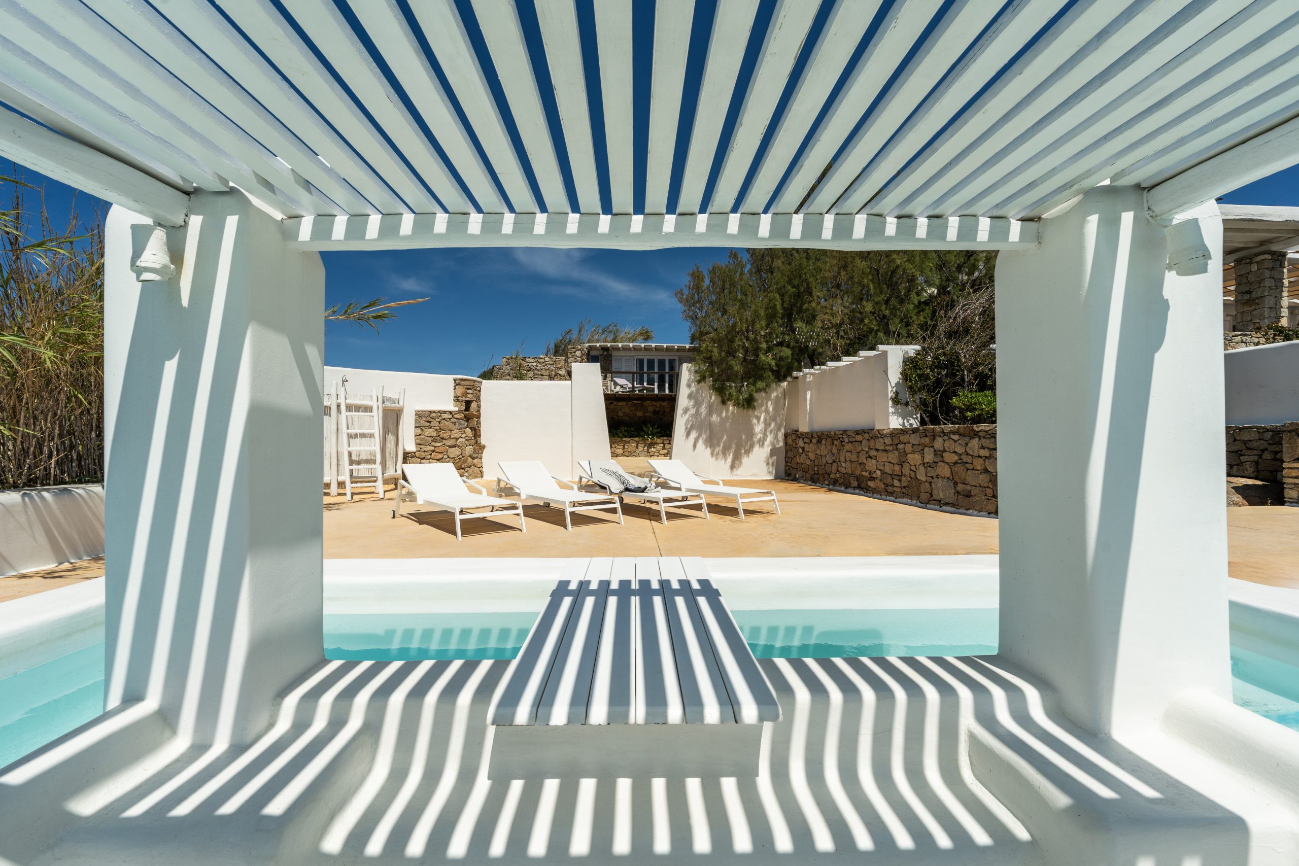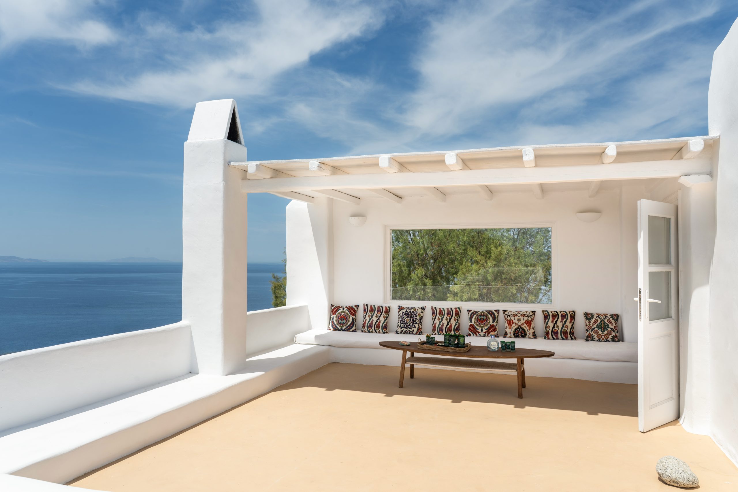La villa équilibre les meilleures qualités du passé et du présent avec le respect des anciens bâtisseurs cycladiques pour les contraintes de la nature, créant un environnement unique : murs blancs étincelants, chambres charmantes avec leurs propres bains et terrasses, terrasses pittoresques et plantations entourant la maison qui reflètent la direction du vent. Des tentes accueillantes et des pergolas protègent les pluies d’hiver pour une utilisation ultérieure. Bien que la maison soit principalement occupée en été, sa forme vernaculaire, qui respecte les strictes lois locales de construction, rend la vie à Mykonos fascinante et toute l’année. La quincaillerie, le mobilier et les accessoires ont été sélectionnés dans un esprit rien de moins, issus des meilleures sources disponibles dans le monde entier. Le mobilier de salon extérieur, par exemple, vient du Mexique et le mobilier d’intérieur est l’œuvre collective de nombreux endroits dans le monde. Les tapis, lampes et menuiseries sont des produits du Maroc, la ferronnerie vient de Tunisie, et les portes représentent l’artisanat de l’Inde et de l’Arabie saoudite. La piscine, longue de 20 m sur 2,5 m de large, est construite au sommet d’une colline rocheuse adjacente à un salon de salle sous une tente. Le design unique met en valeur l’aménagement paysager de la maison.