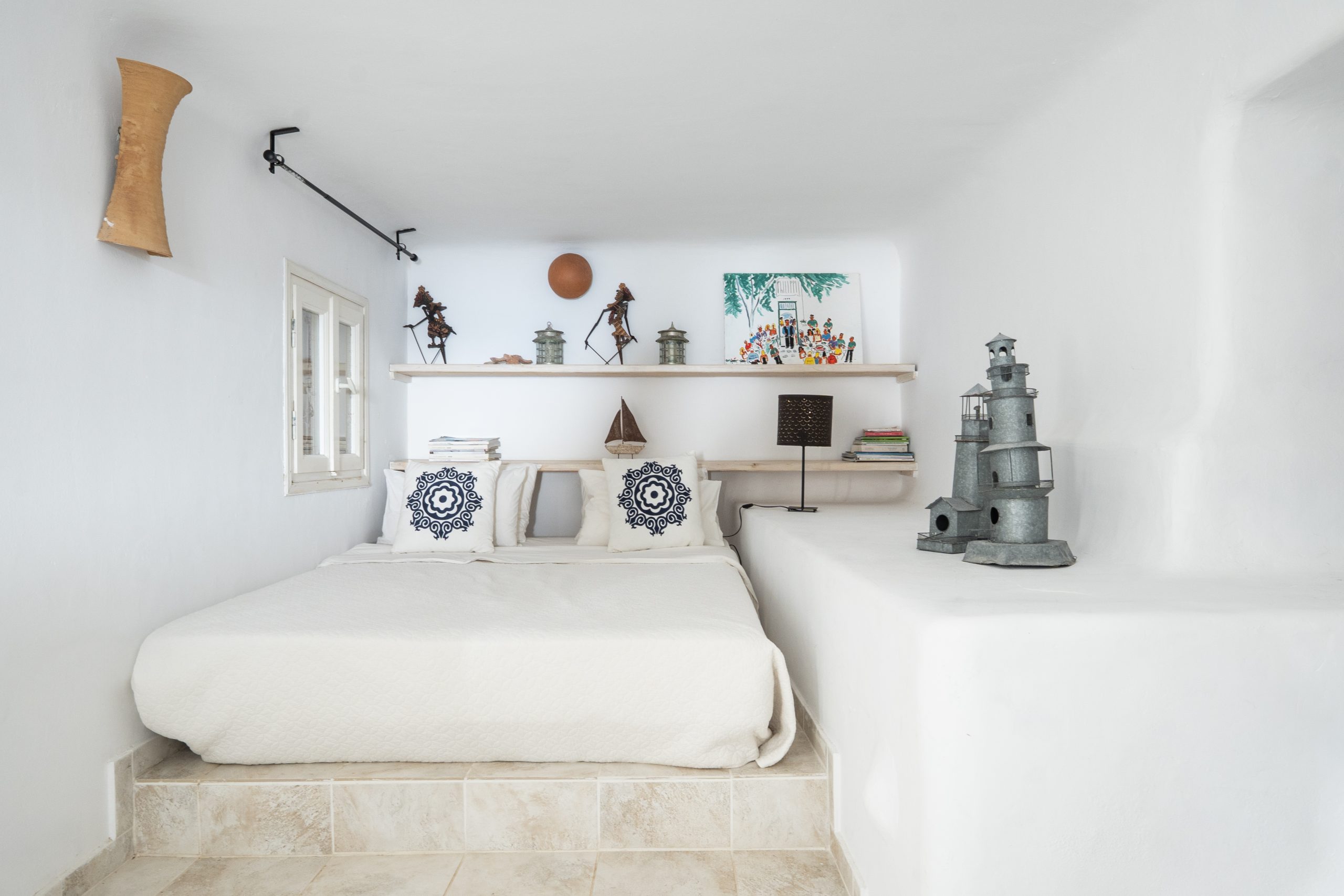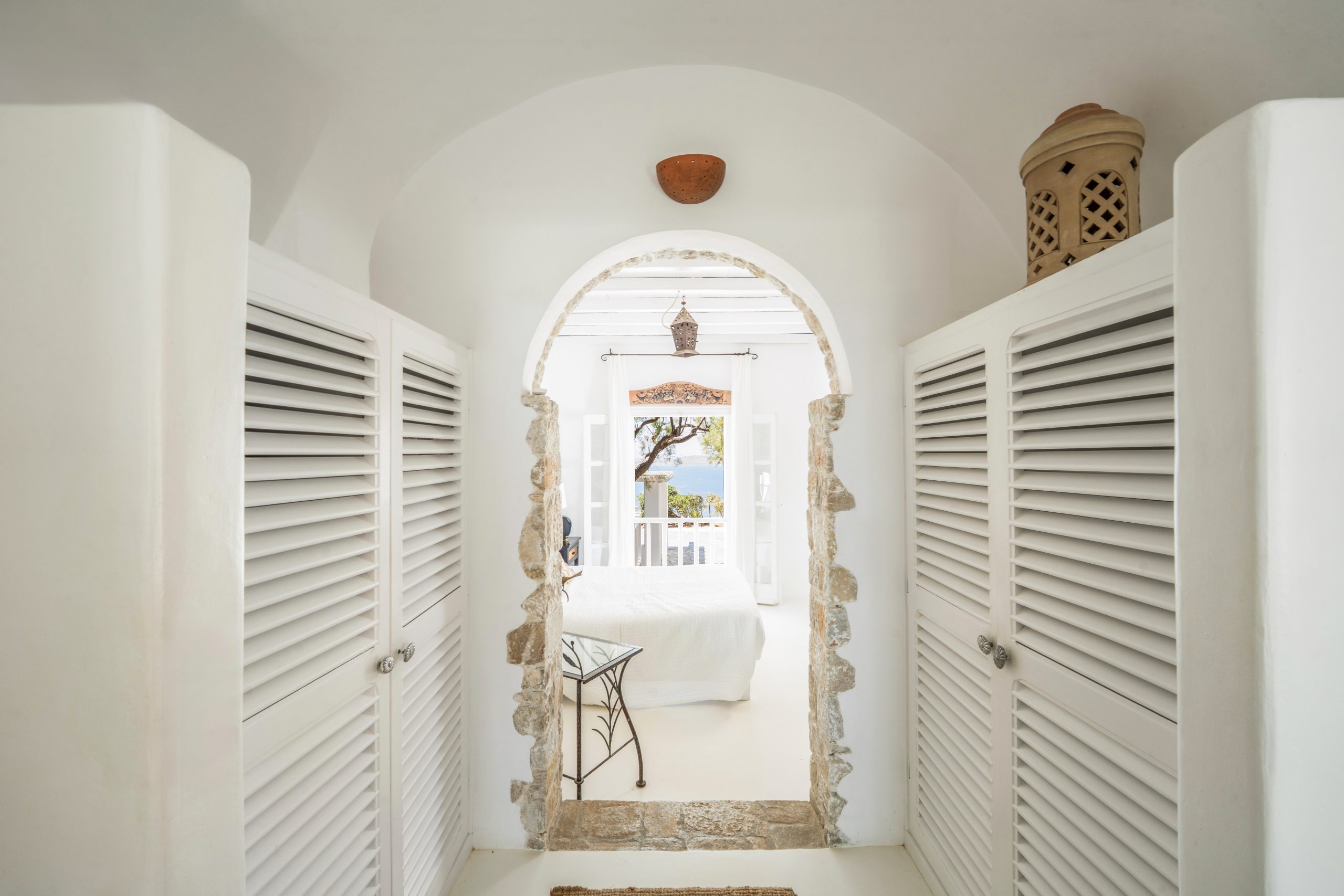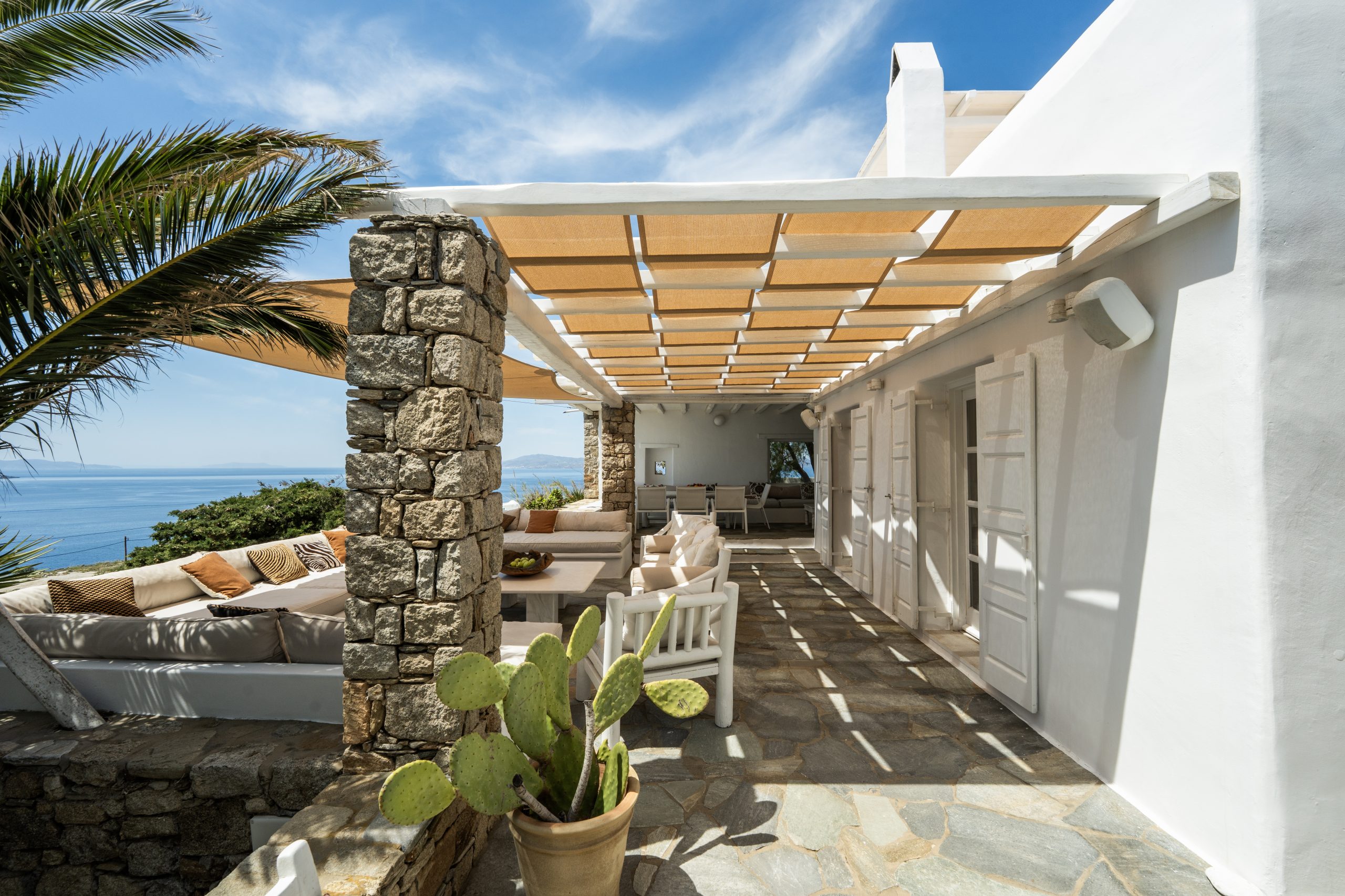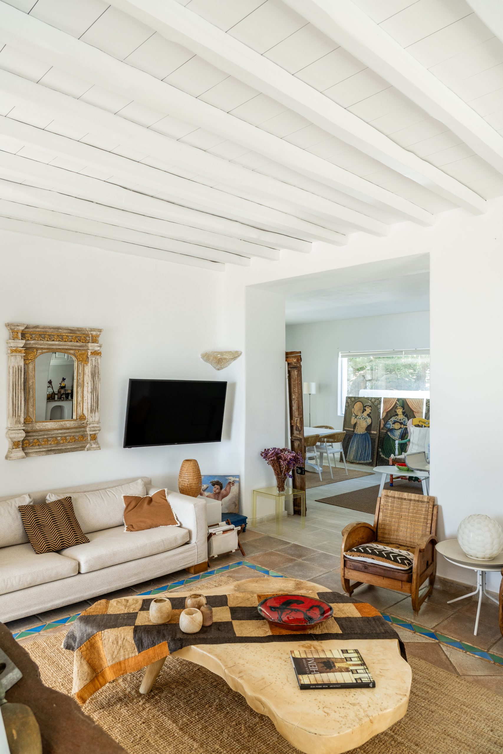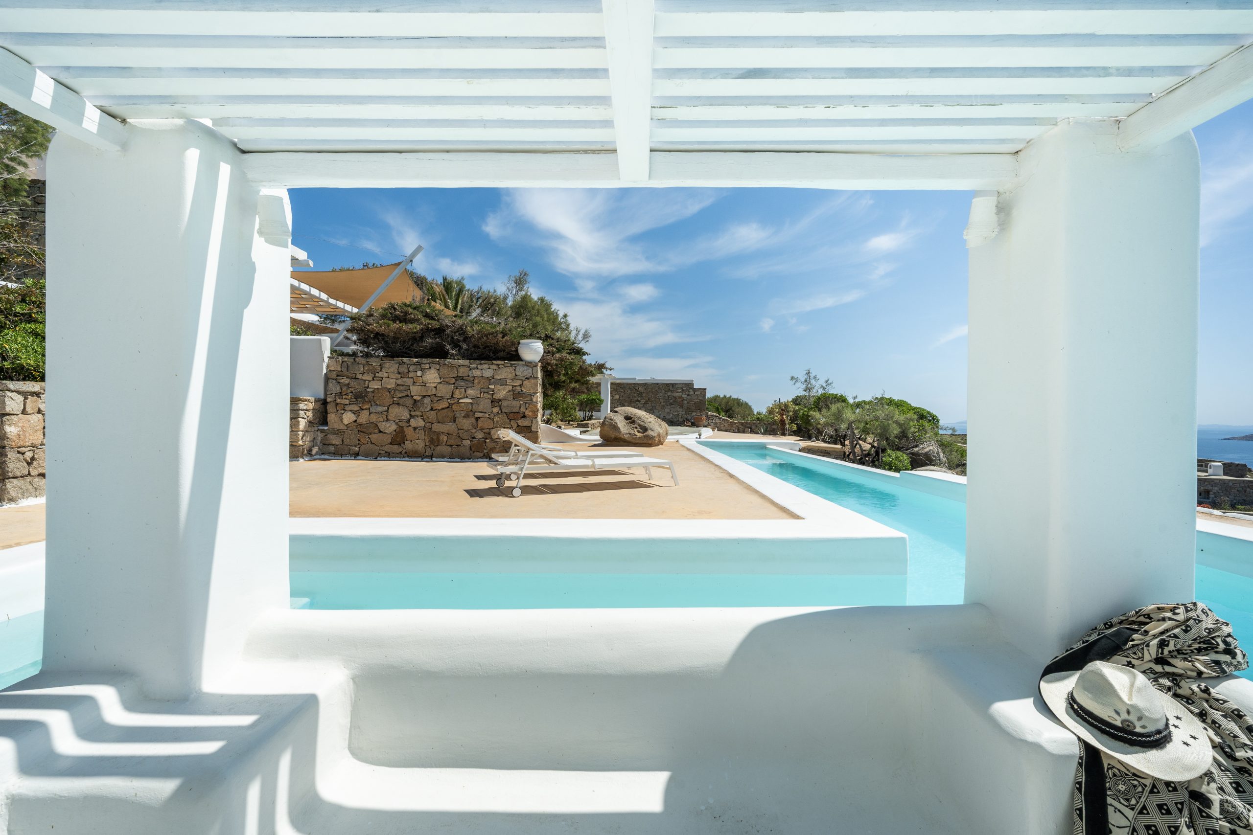 La villa équilibre les meilleures qualités du passé et du présent avec le respect des anciens bâtisseurs cycladiques pour les contraintes de la nature, créant un environnement unique : murs blancs étincelants, chambres charmantes avec leurs propres bains et terrasses, terrasses pittoresques et plantations entourant la maison qui reflètent la direction du vent. Des tentes accueillantes et des pergolas protègent les pluies d’hiver pour une utilisation ultérieure. Bien que la maison soit principalement occupée en été, sa forme vernaculaire, qui respecte les strictes lois locales de construction, rend la vie à Mykonos fascinante et toute l’année. La quincaillerie, le mobilier et les accessoires ont été sélectionnés dans un esprit rien de moins, issus des meilleures sources disponibles dans le monde entier. Le mobilier de salon extérieur, par exemple, vient du Mexique et le mobilier d’intérieur est l’œuvre collective de nombreux endroits dans le monde. Les tapis, lampes et menuiseries sont des produits du Maroc, la ferronnerie vient de Tunisie, et les portes représentent l’artisanat de l’Inde et de l’Arabie saoudite. La piscine, longue de 20 m sur 2,5 m de large, est construite au sommet d’une colline rocheuse adjacente à un salon de salle sous une tente. Le design unique met en valeur l’aménagement paysager de la maison.