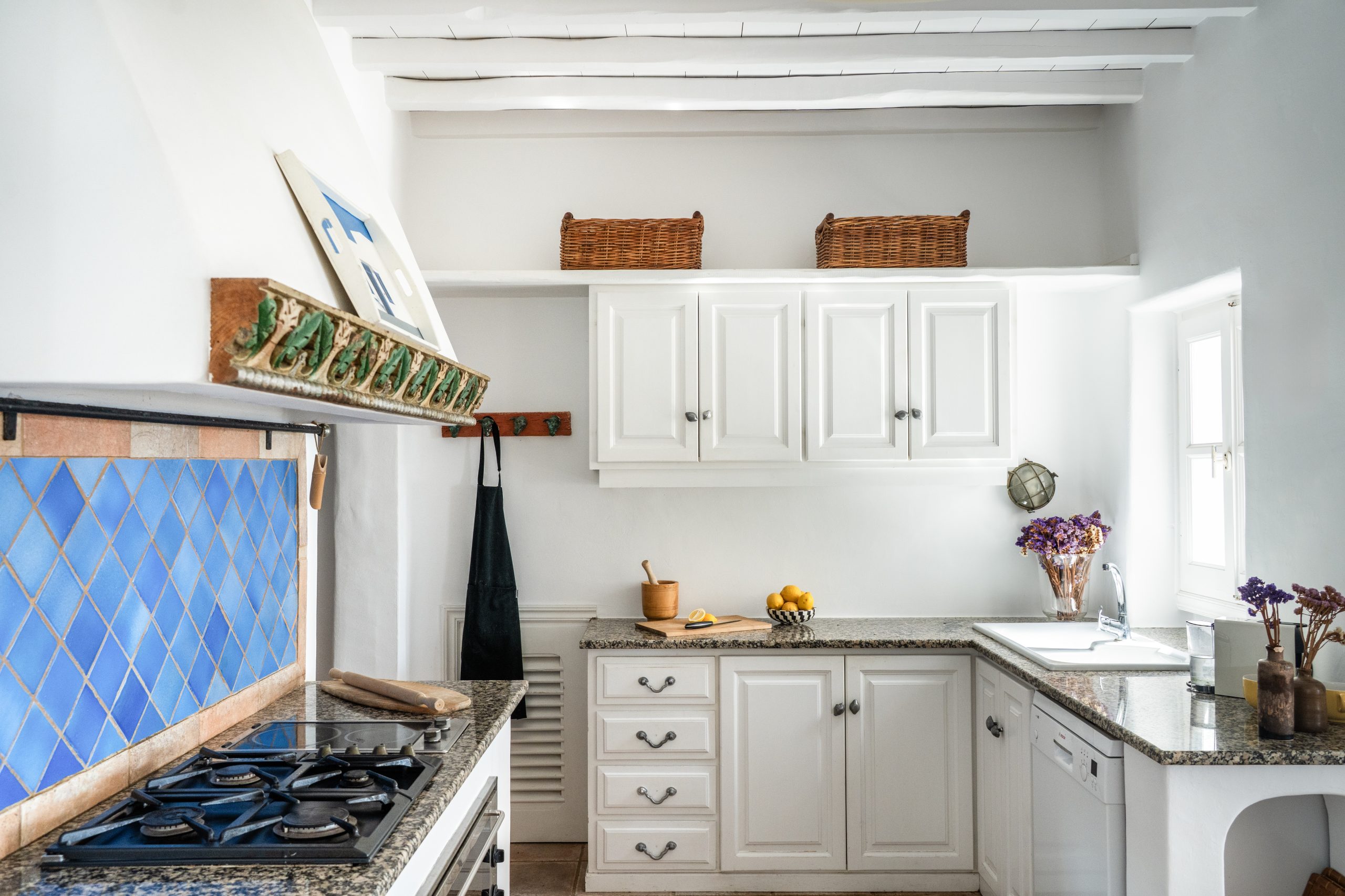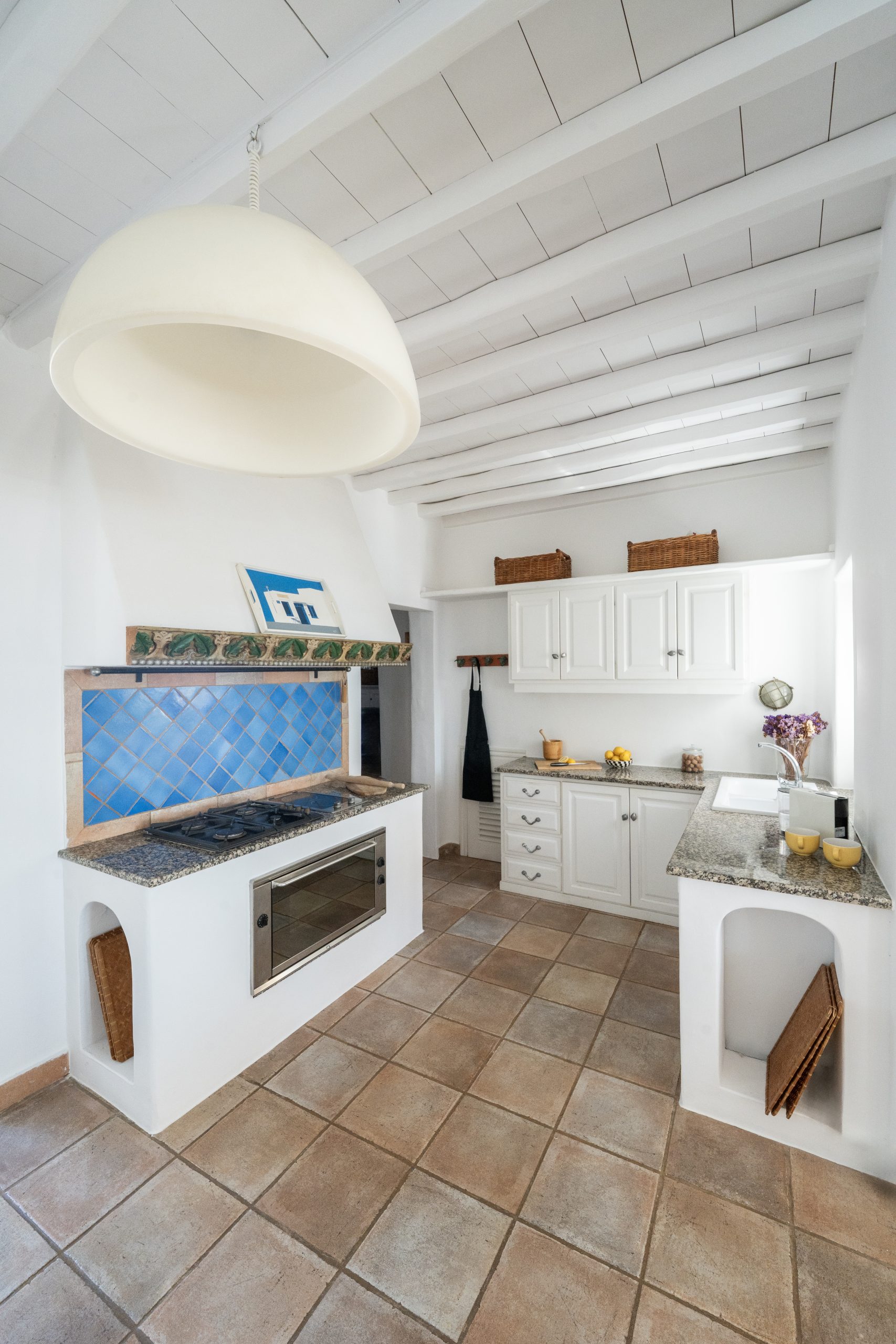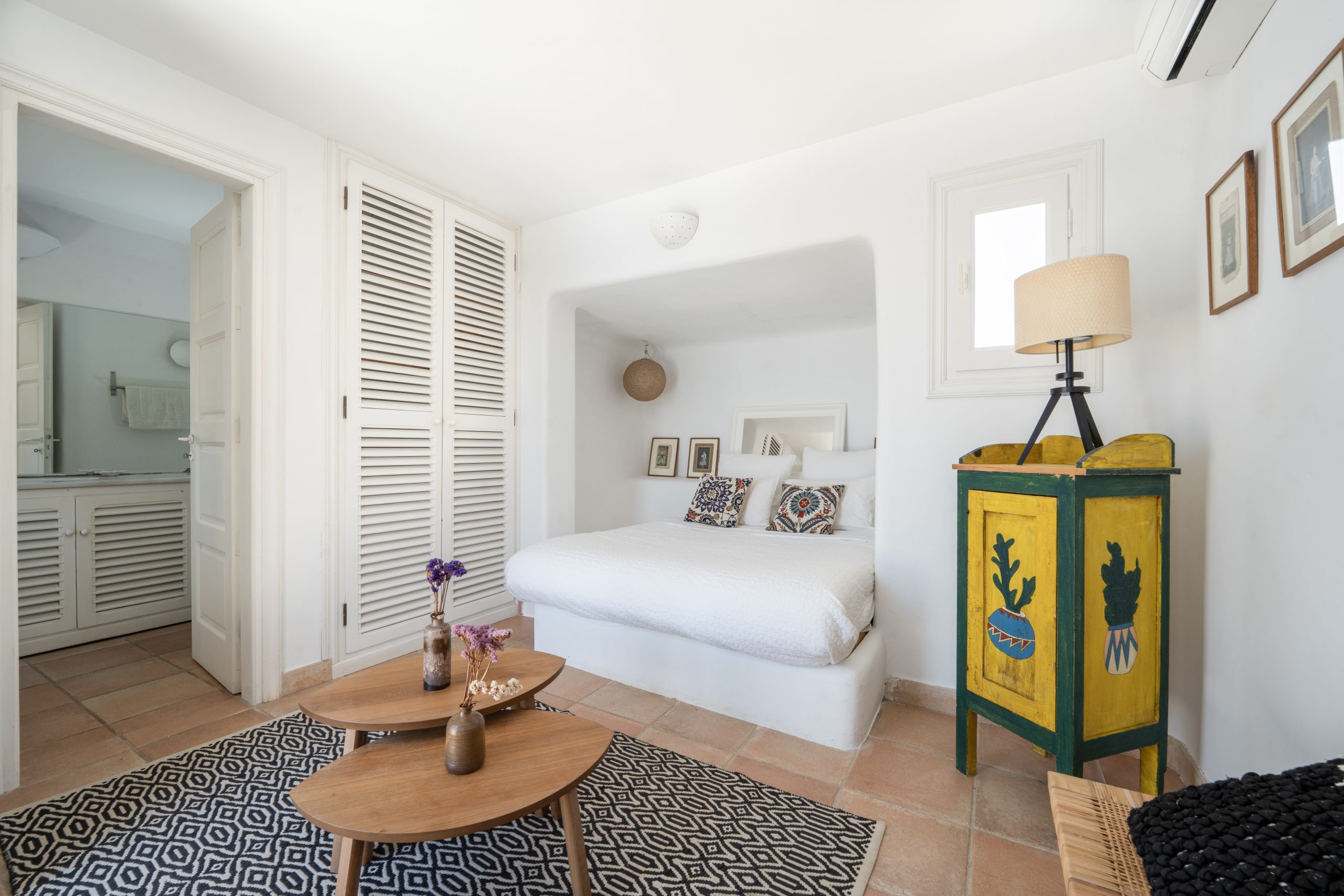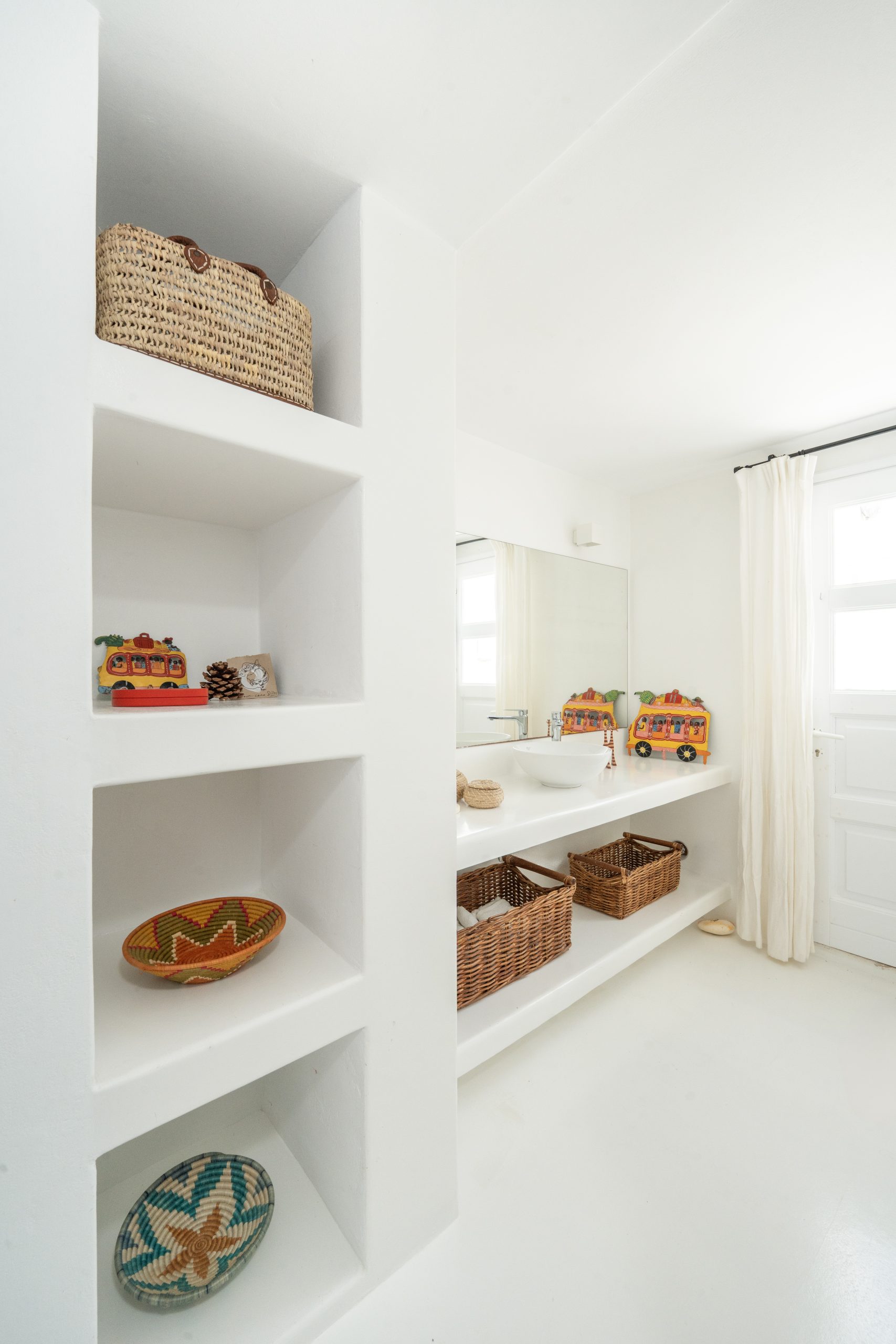 La villa équilibre les meilleures qualités du passé et du présent avec le respect des anciens bâtisseurs cycladiques pour les contraintes de la nature, créant un environnement unique : murs blancs étincelants, chambres charmantes avec leurs propres bains et terrasses, terrasses pittoresques et plantations entourant la maison qui reflètent la direction du vent. Des tentes accueillantes et des pergolas protègent les pluies d’hiver pour une utilisation ultérieure. Bien que la maison soit principalement occupée en été, sa forme vernaculaire, qui respecte les strictes lois locales de construction, rend la vie à Mykonos fascinante et toute l’année. La quincaillerie, le mobilier et les accessoires ont été sélectionnés dans un esprit rien de moins, issus des meilleures sources disponibles dans le monde entier. Le mobilier de salon extérieur, par exemple, vient du Mexique et le mobilier d’intérieur est l’œuvre collective de nombreux endroits dans le monde. Les tapis, lampes et menuiseries sont des produits du Maroc, la ferronnerie vient de Tunisie, et les portes représentent l’artisanat de l’Inde et de l’Arabie saoudite. La piscine, longue de 20 m sur 2,5 m de large, est construite au sommet d’une colline rocheuse adjacente à un salon de salle sous une tente. Le design unique met en valeur l’aménagement paysager de la maison.