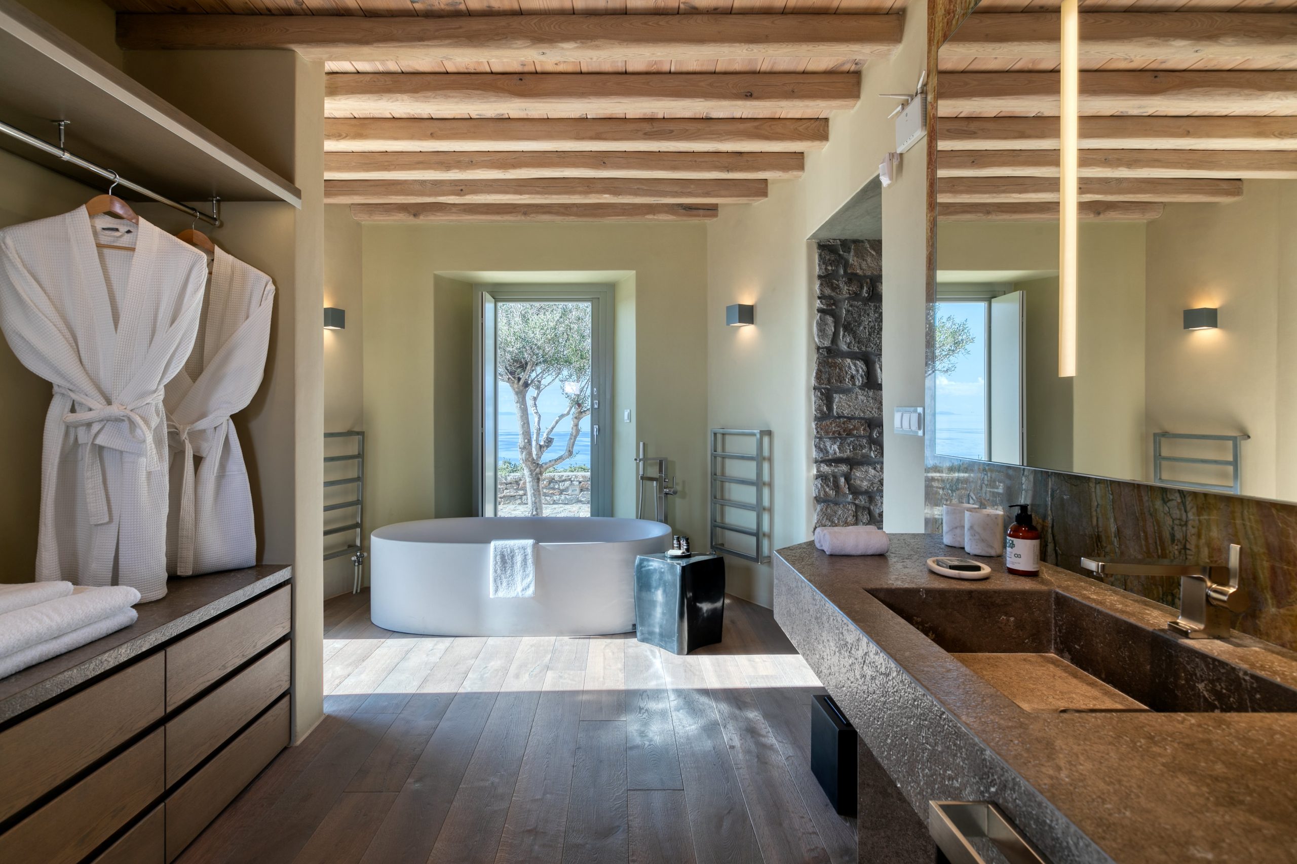 – Chambre 1 – Keli : lit king size, salle de bain attenante avec douche à effet pluie et baignoire, dressing, coffre-fort, coin salon, kitchenette, vue sur la mer