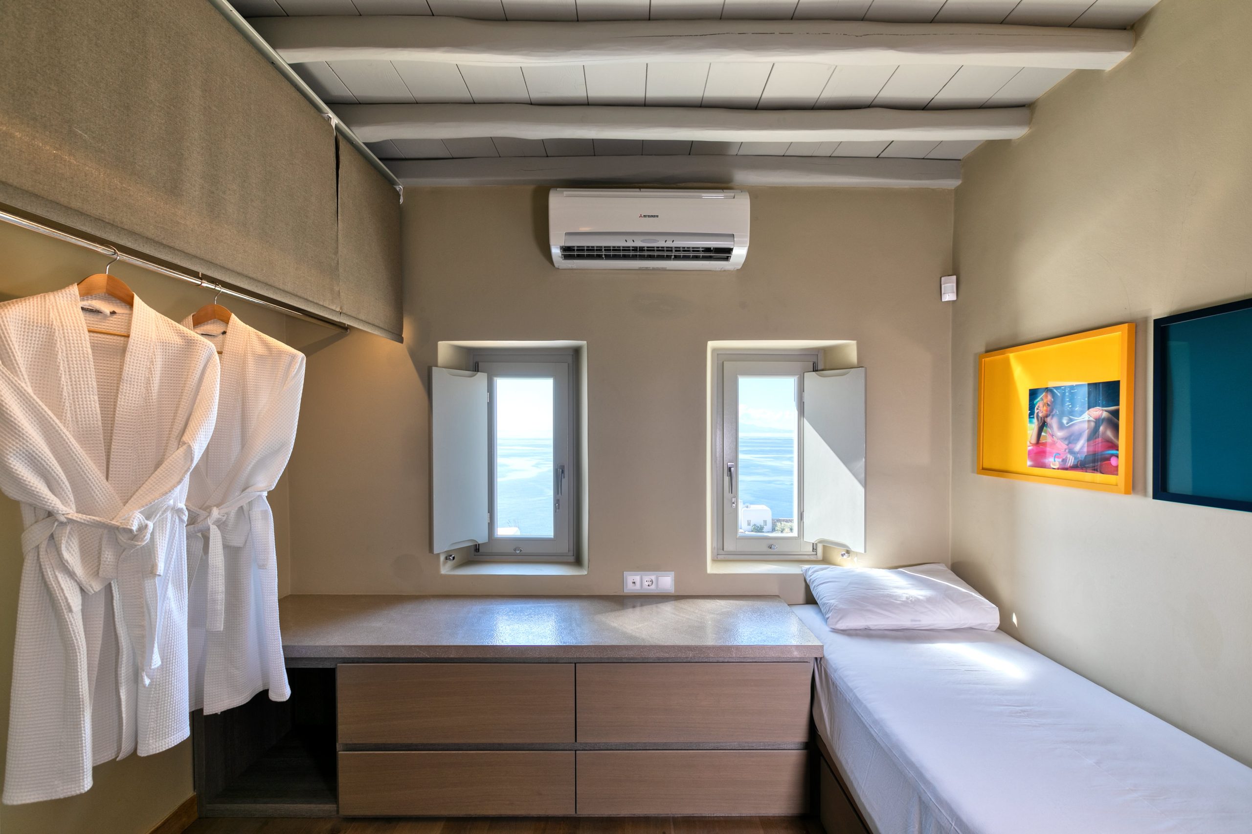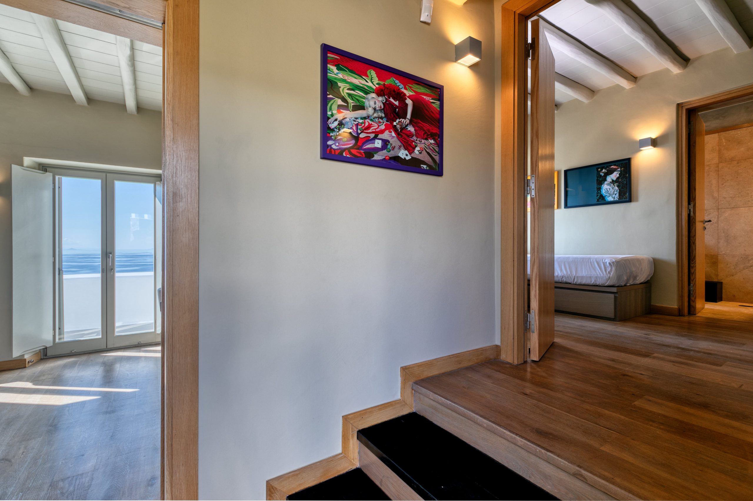 – Chambre 2 – Suite 1 : lit double, lit simple, salle de bain attenante avec douche indépendante, vue sur la mer.