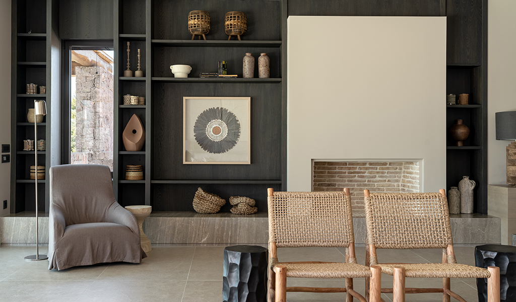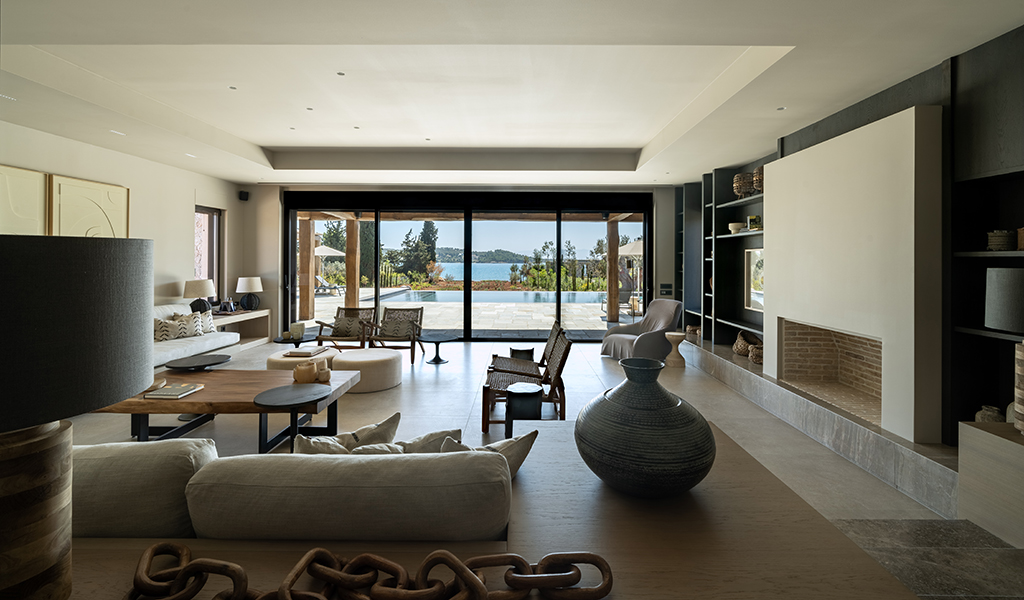 Salon avec cheminée, vue sur la piscine et la mer.