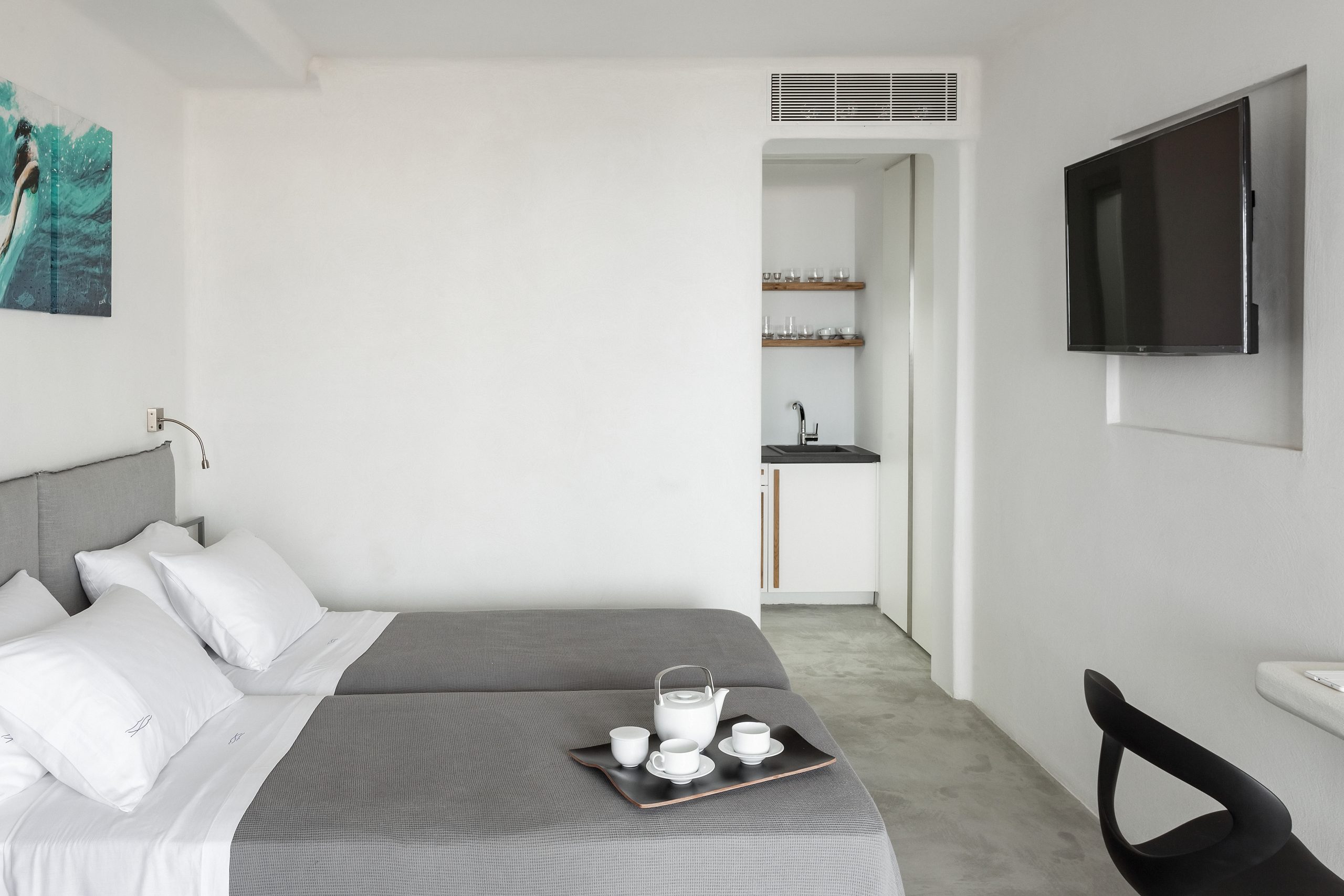 1 bedroom with twin beds [which can be converted into a king-size bed], air conditioning,