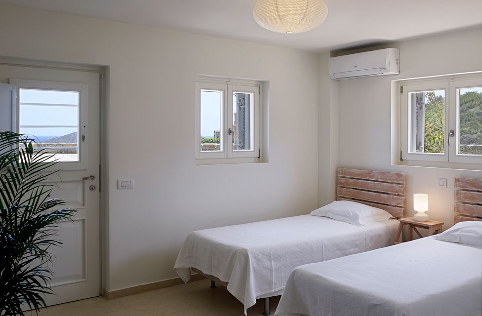 – Chambre cinq : lits jumeaux pouvant être transformés en lit king size (avec surmatelas) avec salle de douche attenante et portes donnant sur une petite terrasse sous la piscine.