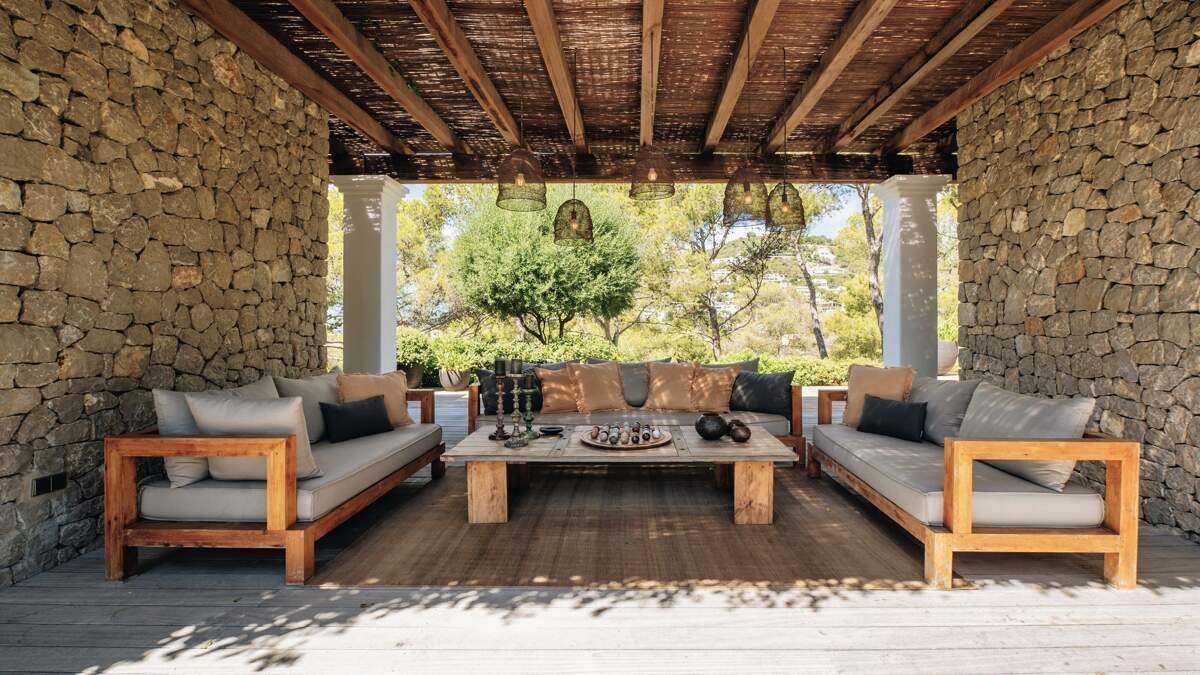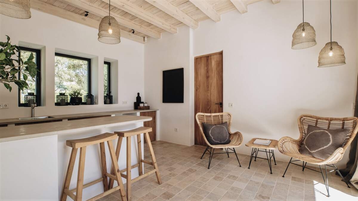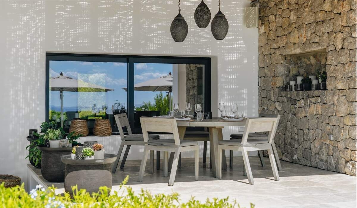 L'intérieur de la villa est magnifiquement décoré, alliant avec art un mobilier chic et contemporain à des touches rustiques traditionnelles. Le salon et la salle à manger spacieux et ouverts offrent une vue imprenable sur la mer, parfaite pour se détendre.
