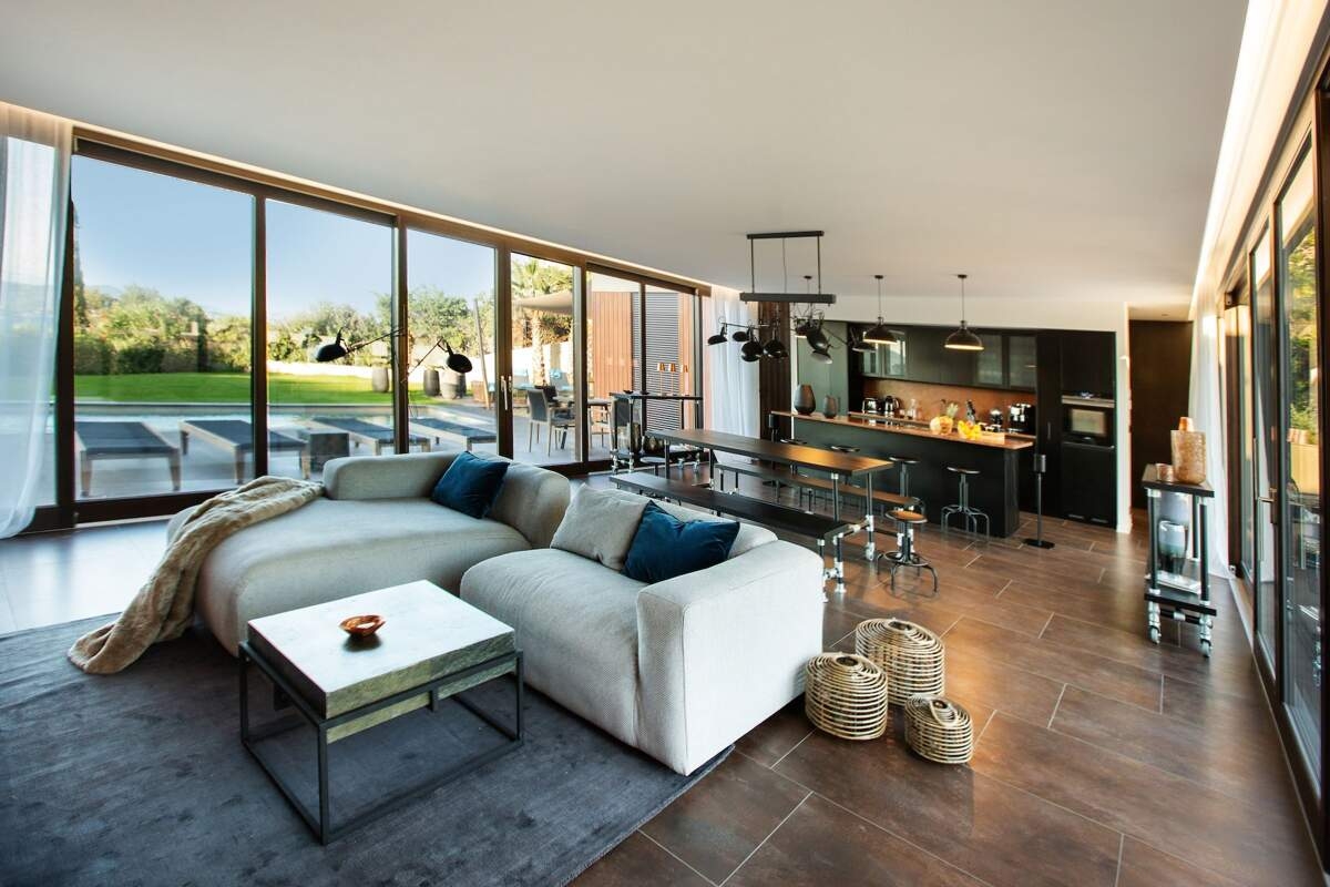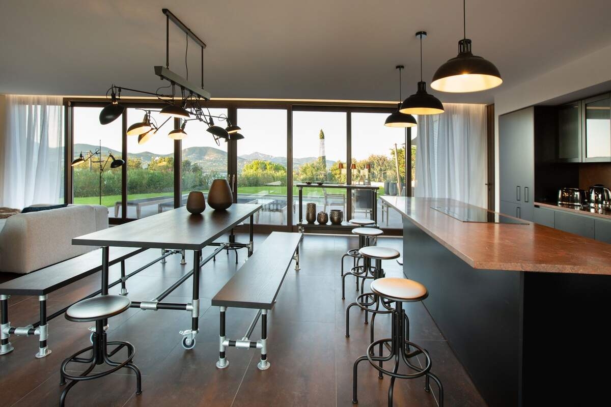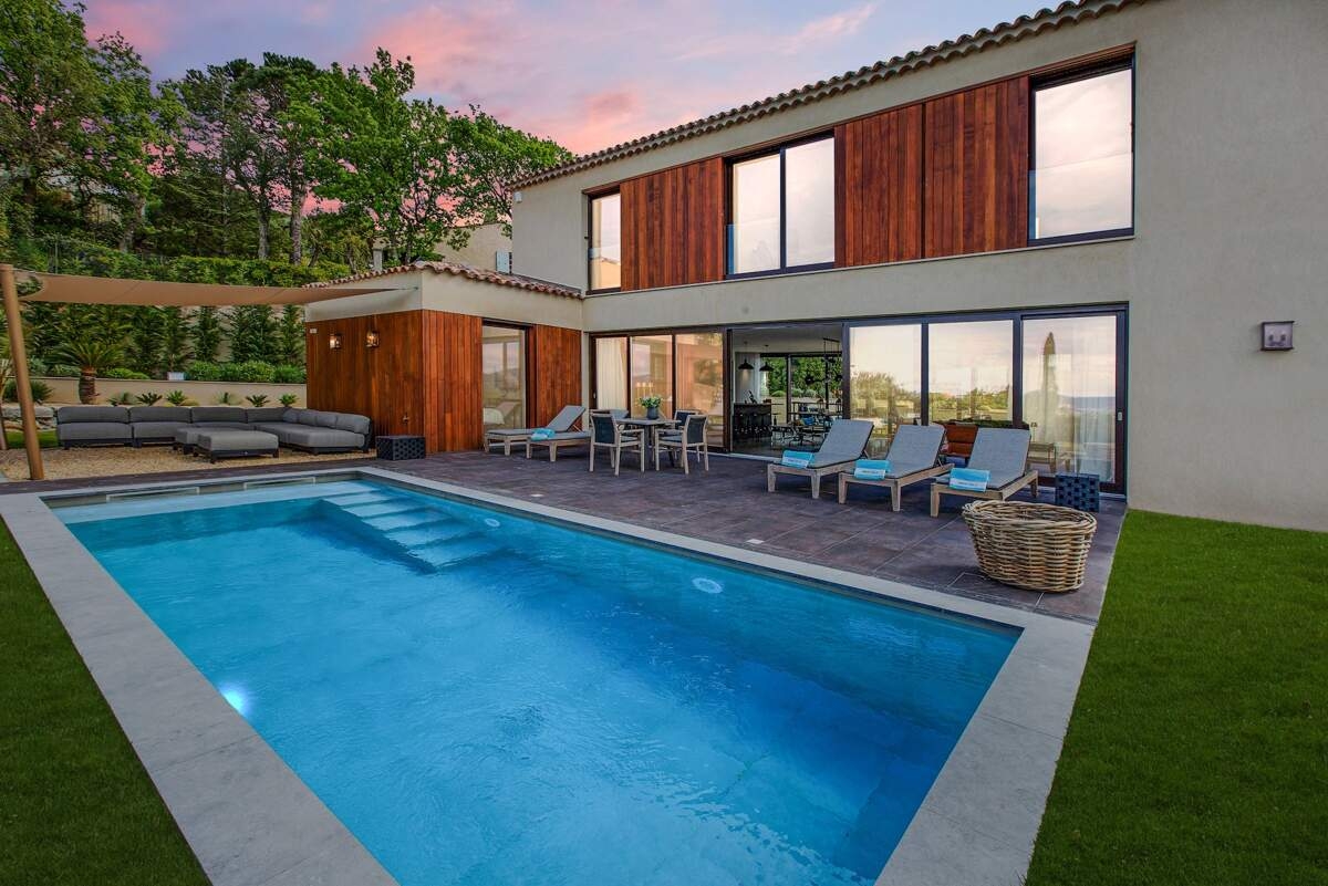 À Gassin, la Villa Lagna se niche entre ciel et mer, dévoilant une architecture élégante aux lignes épurées. Son jardin méditerranéen, parfumé par les pins, se fond harmonieusement dans le paysage, tandis que la mer scintille au loin.