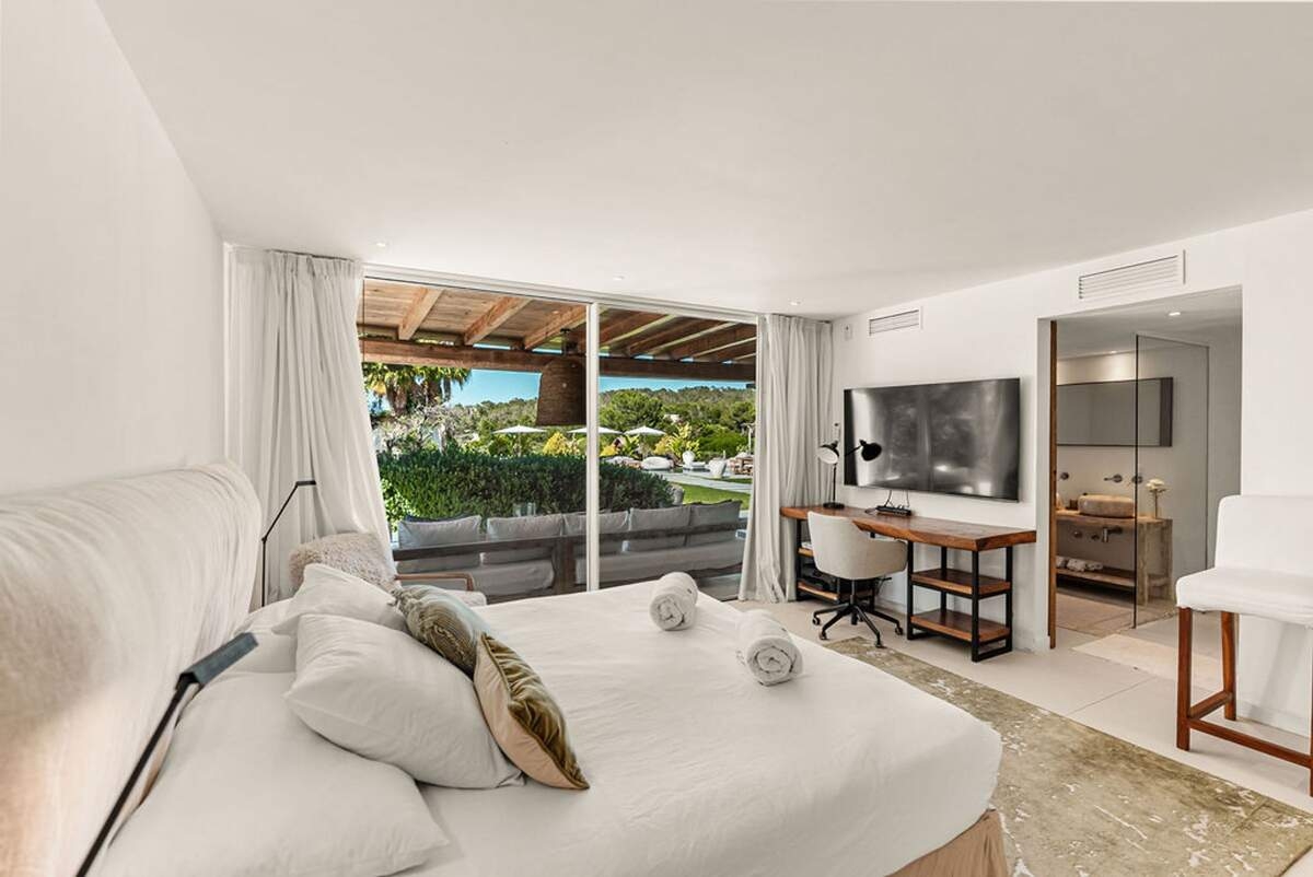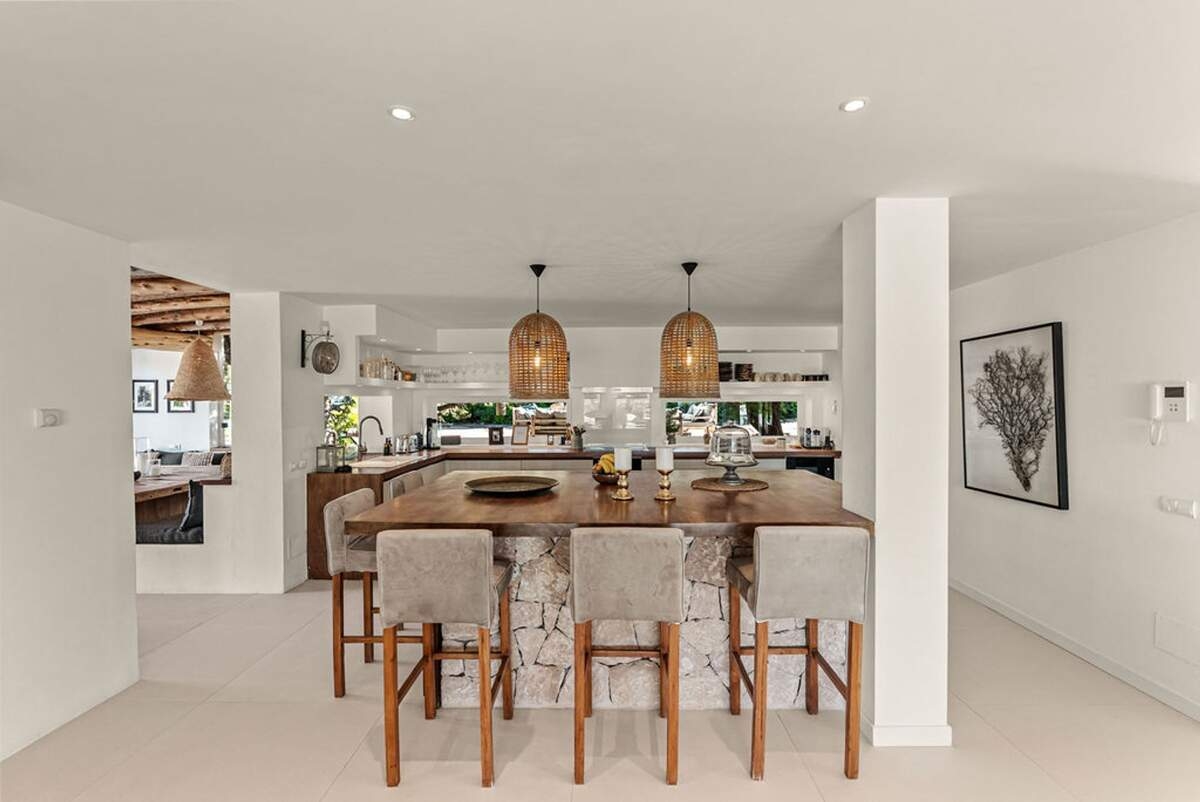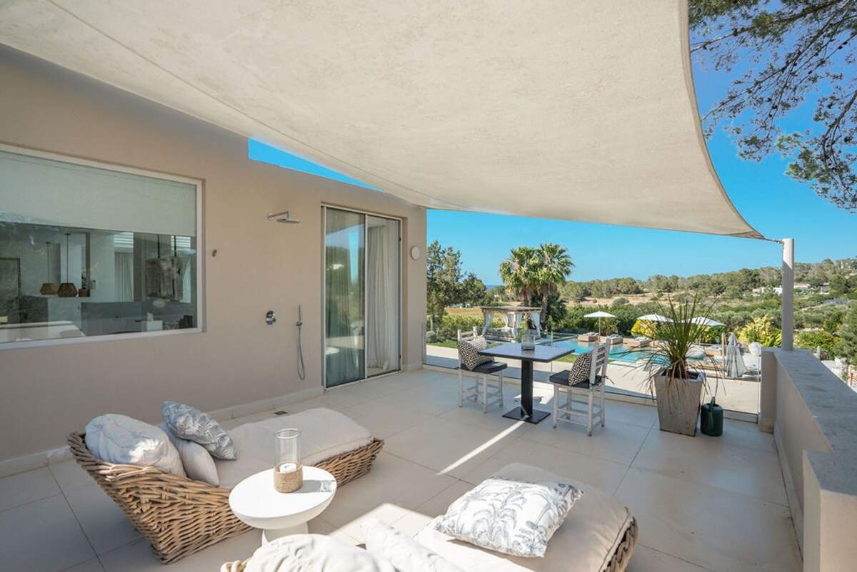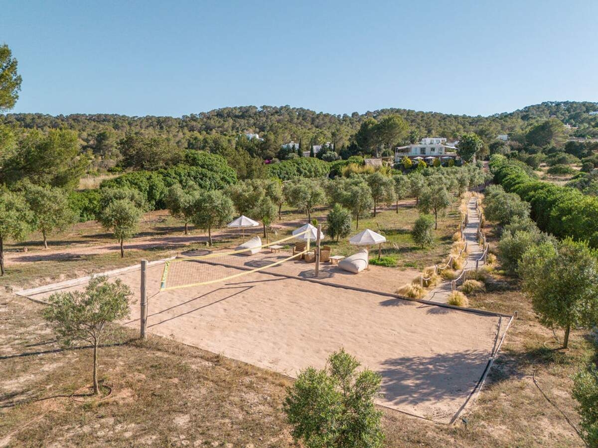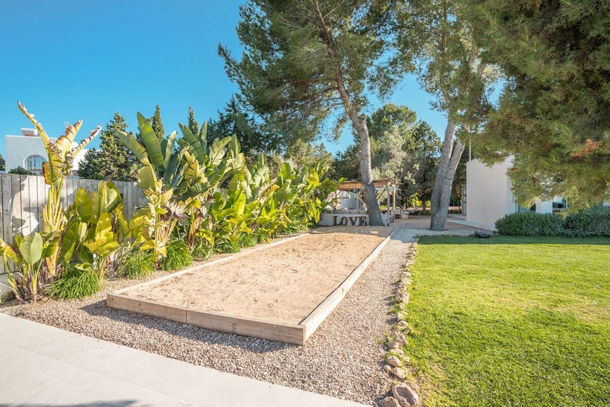 À l'extérieur, le jardin paysager de la villa devient un havre de loisirs et de nature. Suivez un charmant sentier bordé d'oliviers pour découvrir un potager tranquille, parfait pour ceux qui apprécient la vie biologique. Les amateurs de sport apprécieront le terrain de volley-ball privé, idéal pour des matchs amicaux sous le soleil. Commencez votre journée par une baignade dans la piscine, puis détendez-vous sur la grande terrasse ensoleillée ou savourez un repas en plein air dans la salle à manger ombragée, préparé dans la cuisine extérieure entièrement équipée. Au coucher du soleil, retrouvez-vous dans les élégants espaces de vie ou partez à la découverte de la vie nocturne animée d'Ibiza, sachant que votre havre de paix n'est qu'à quelques minutes en voiture.