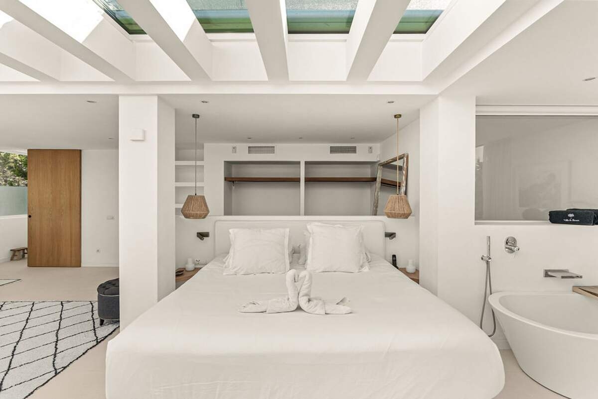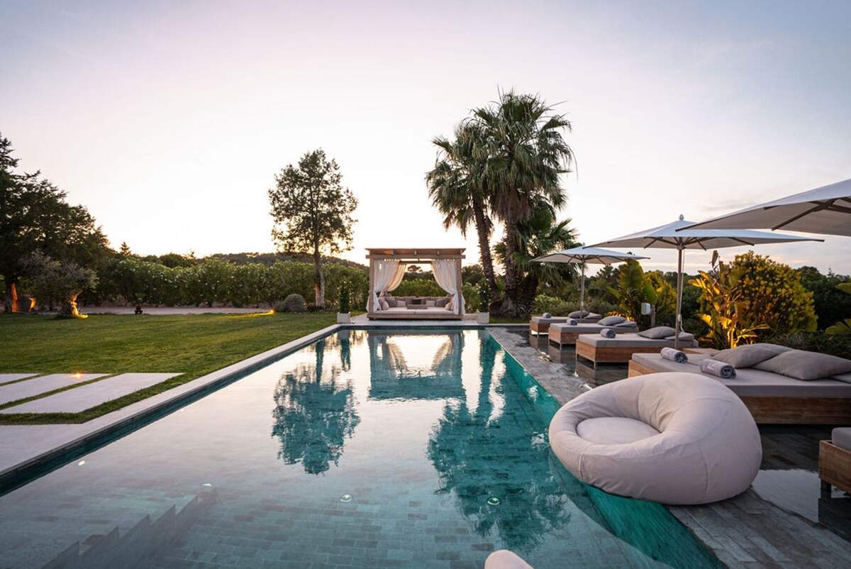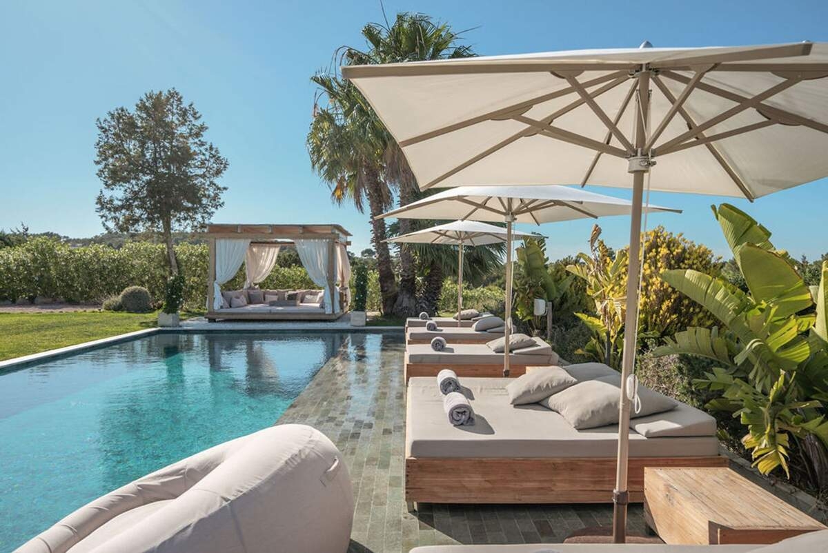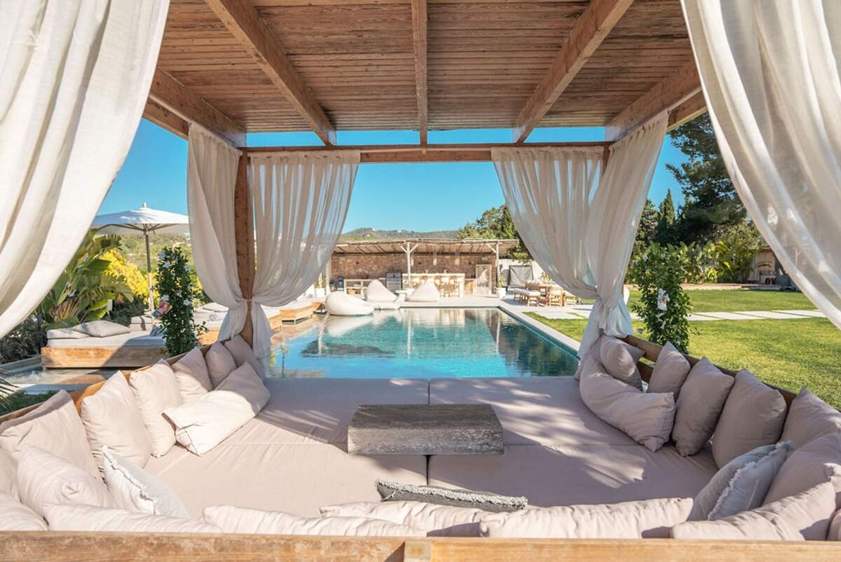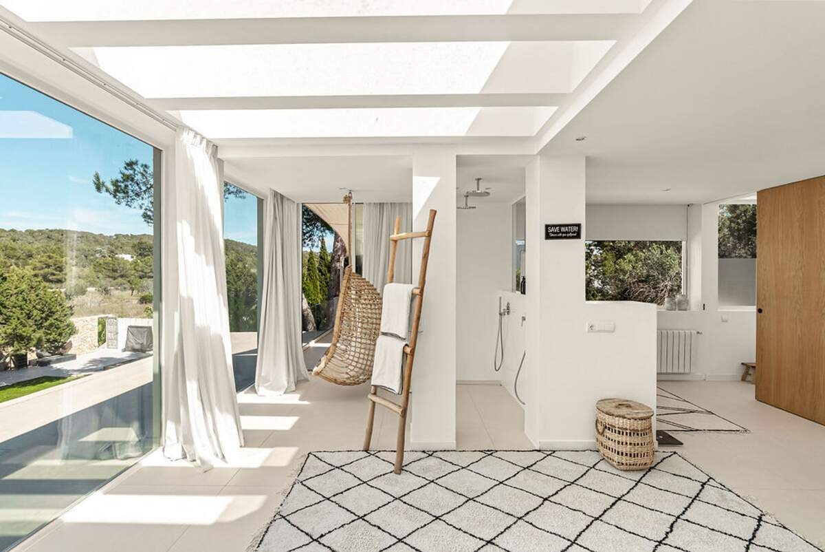 À l'extérieur, le jardin paysager de la villa devient un havre de loisirs et de nature. Suivez un charmant sentier bordé d'oliviers pour découvrir un potager tranquille, parfait pour ceux qui apprécient la vie biologique. Les amateurs de sport apprécieront le terrain de volley-ball privé, idéal pour des matchs amicaux sous le soleil. Commencez votre journée par une baignade dans la piscine, puis détendez-vous sur la grande terrasse ensoleillée ou savourez un repas en plein air dans la salle à manger ombragée, préparé dans la cuisine extérieure entièrement équipée. Au coucher du soleil, retrouvez-vous dans les élégants espaces de vie ou partez à la découverte de la vie nocturne animée d'Ibiza, sachant que votre havre de paix n'est qu'à quelques minutes en voiture.