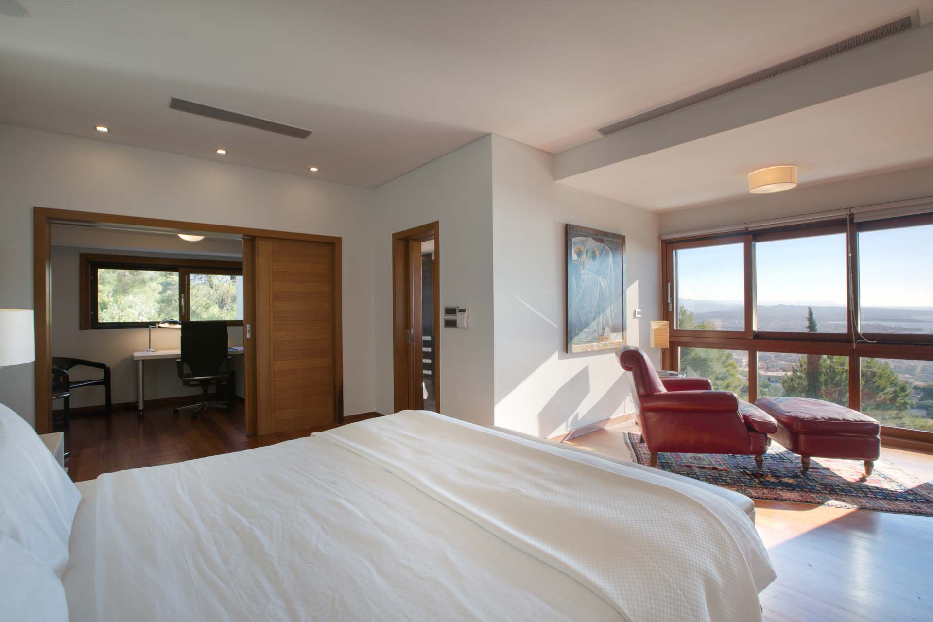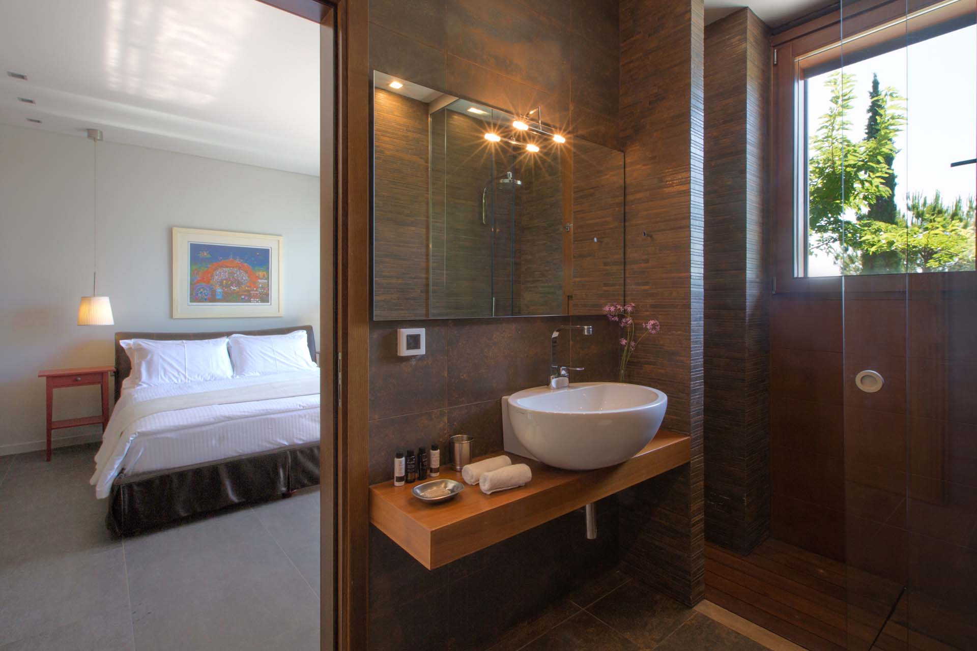 – Chambre 1 (suite présidentielle) – lit king-size (1,8 x 2 m), salon, coin bureau, dressing, salle de bains attenante avec douche, mini-piscine privée avec hydromassage et balcon privé.