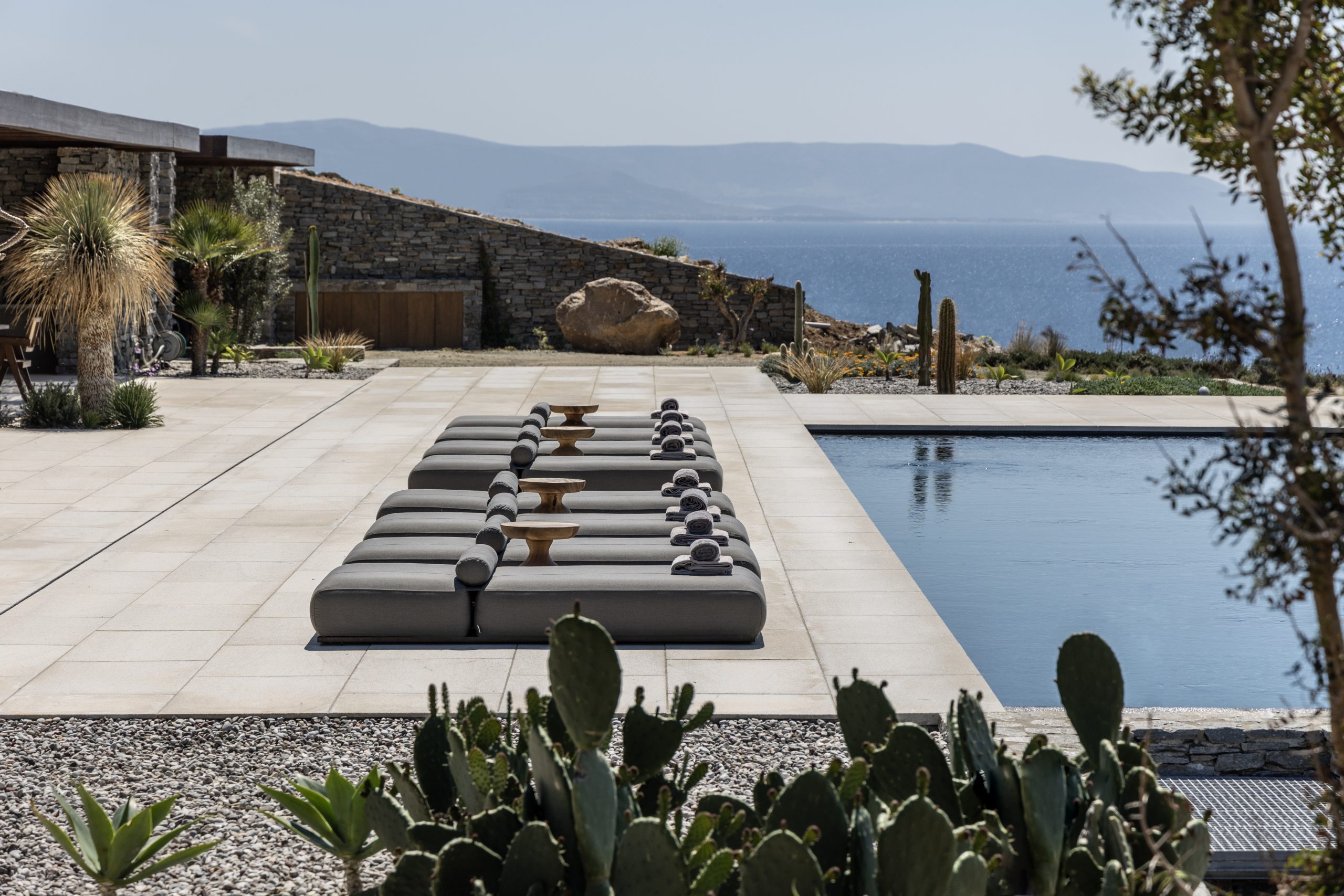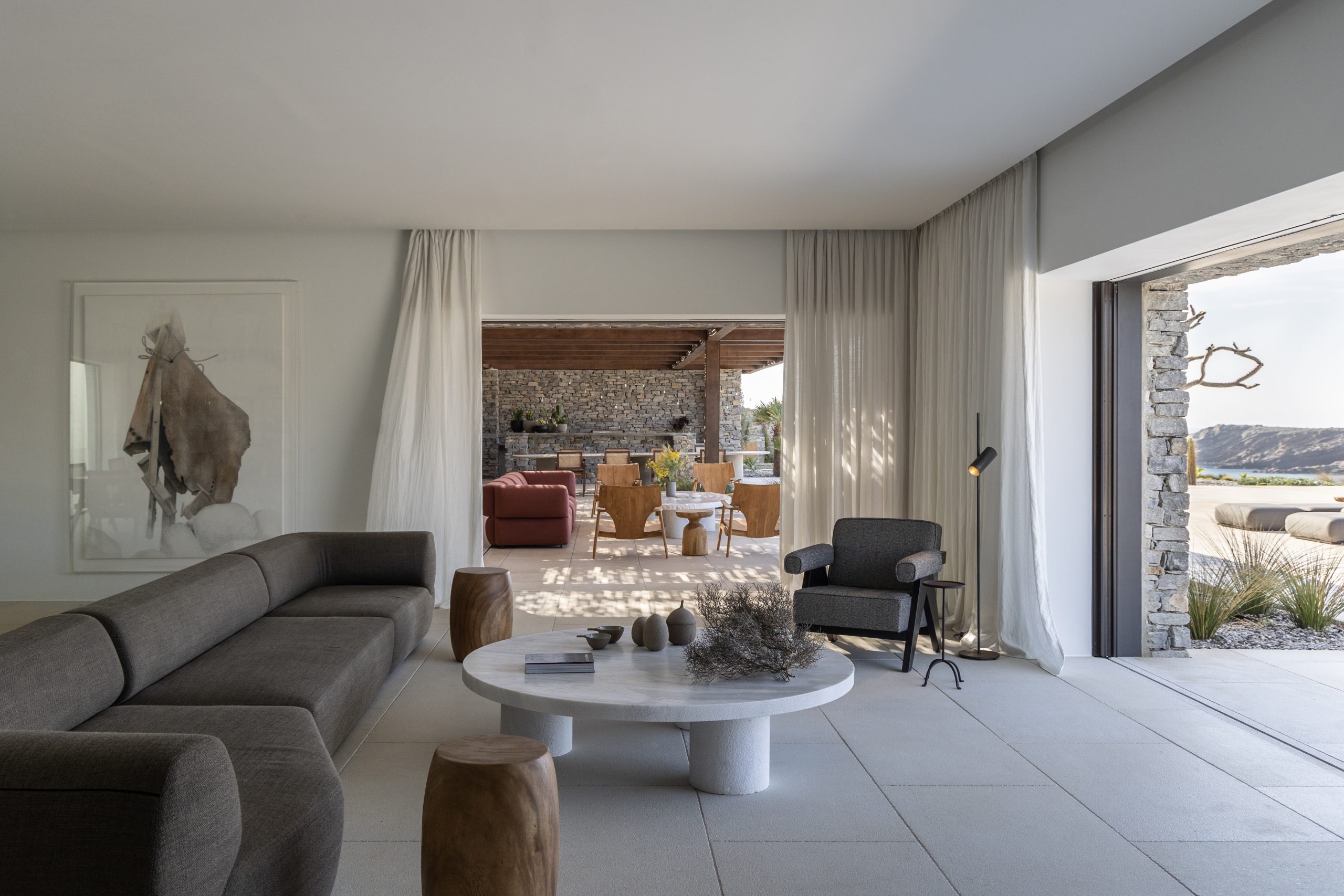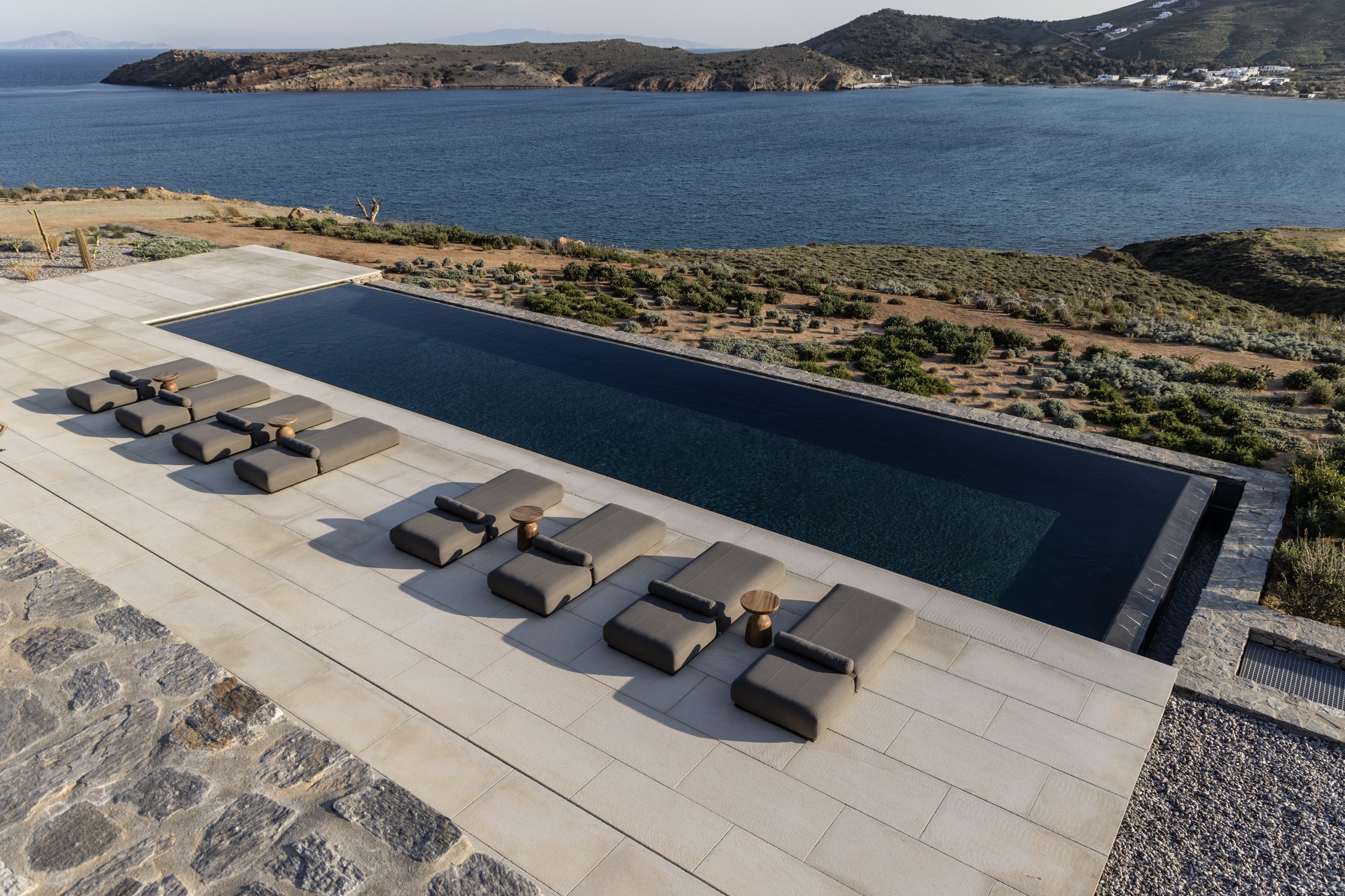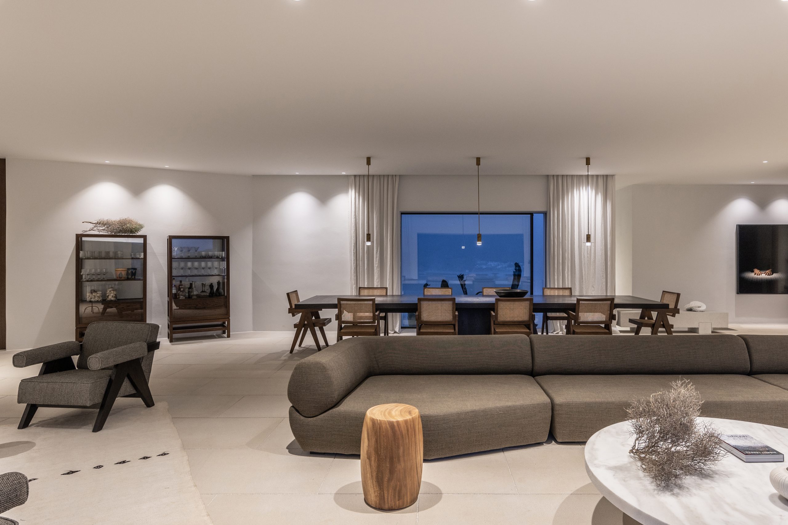 REZ-DE-CHAUSSÉE Espace de vie moderne et ouvert, décoré dans des tons ocres, s’ouvrant sur la terrasse de la piscine avec une vue magnifique sur la mer et le monastère de St Antonios. Grande salle à manger pouvant accueillir confortablement jusqu’à 20 personnes. WC invités Cuisine professionnelle, avec passe-plat donnant sur la terrasse de la piscine.