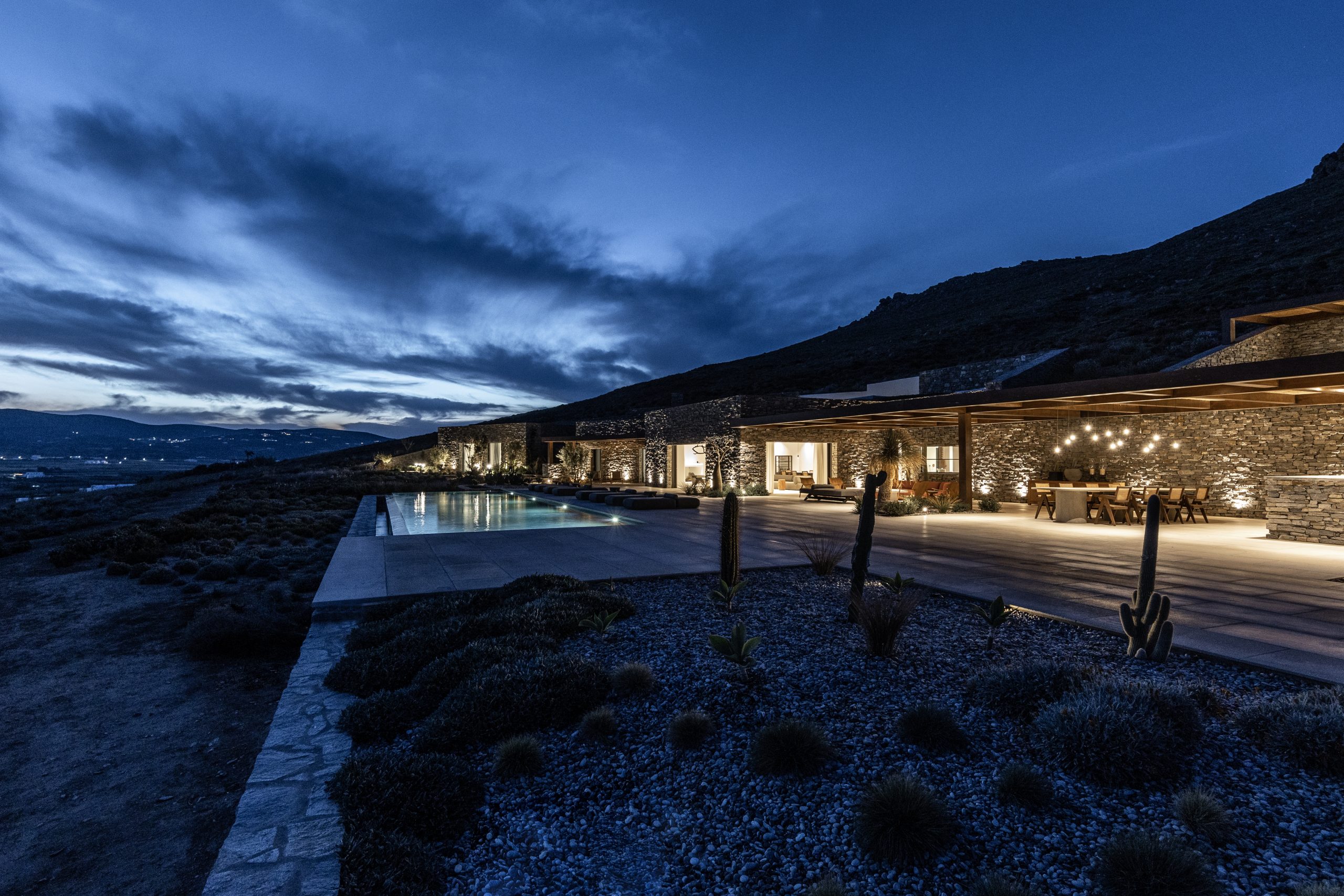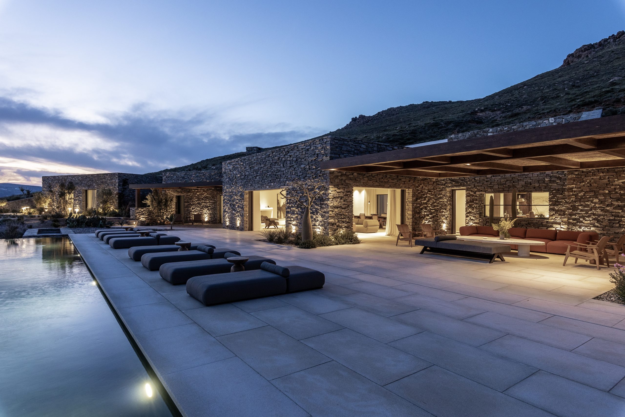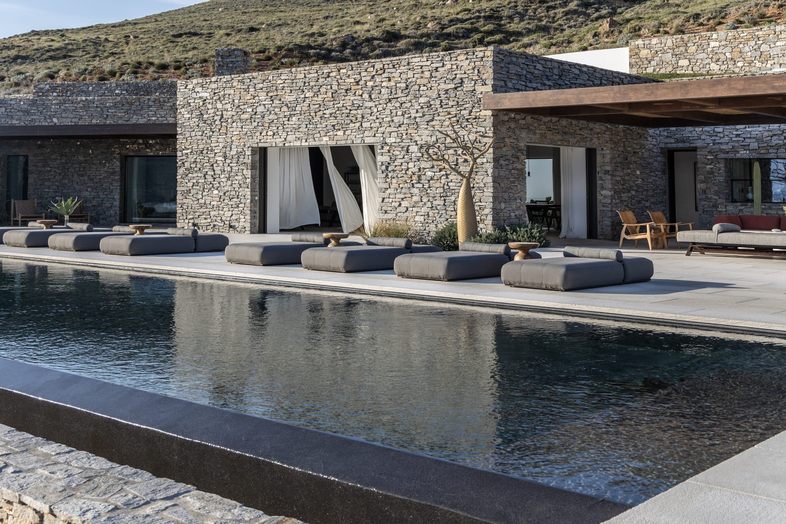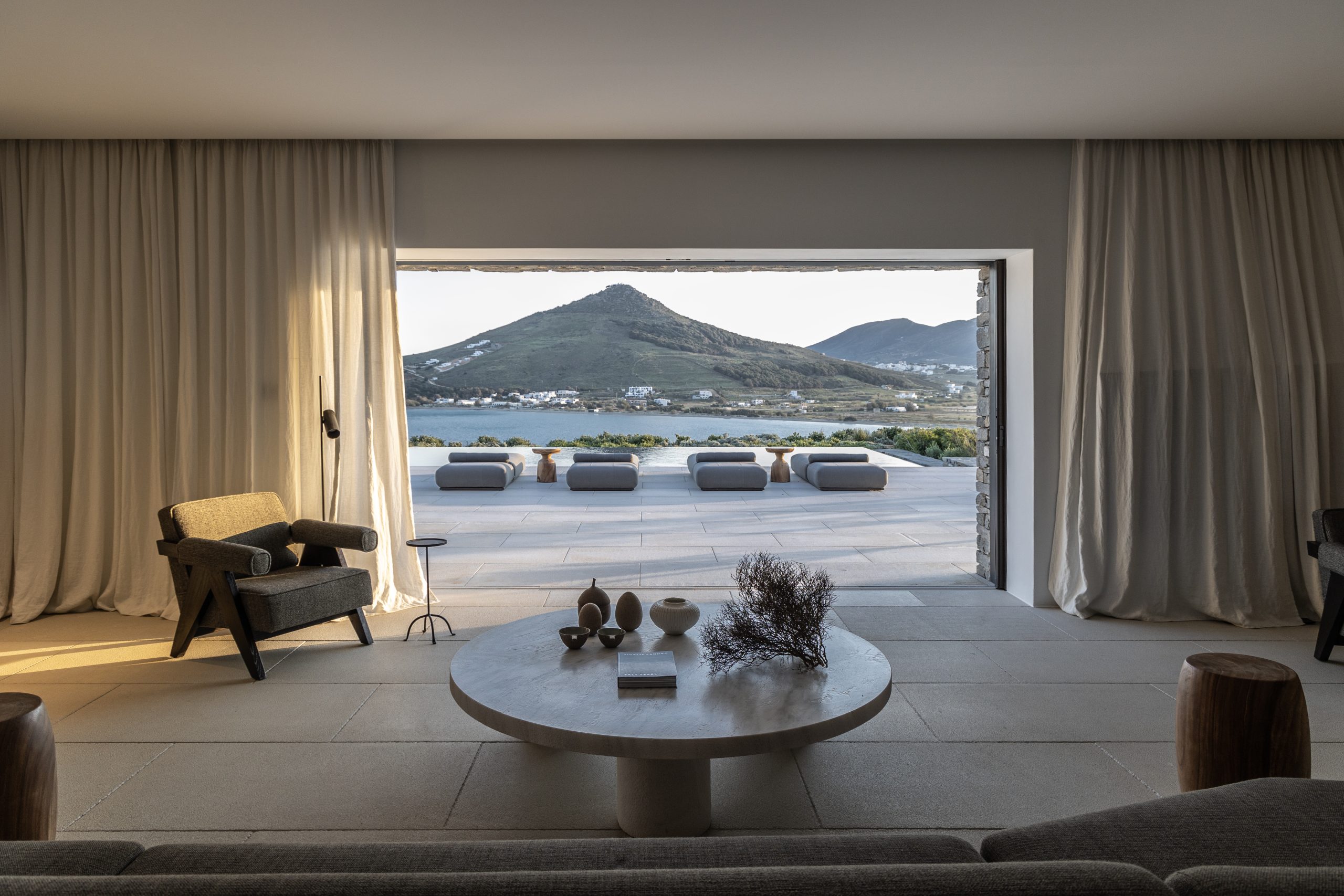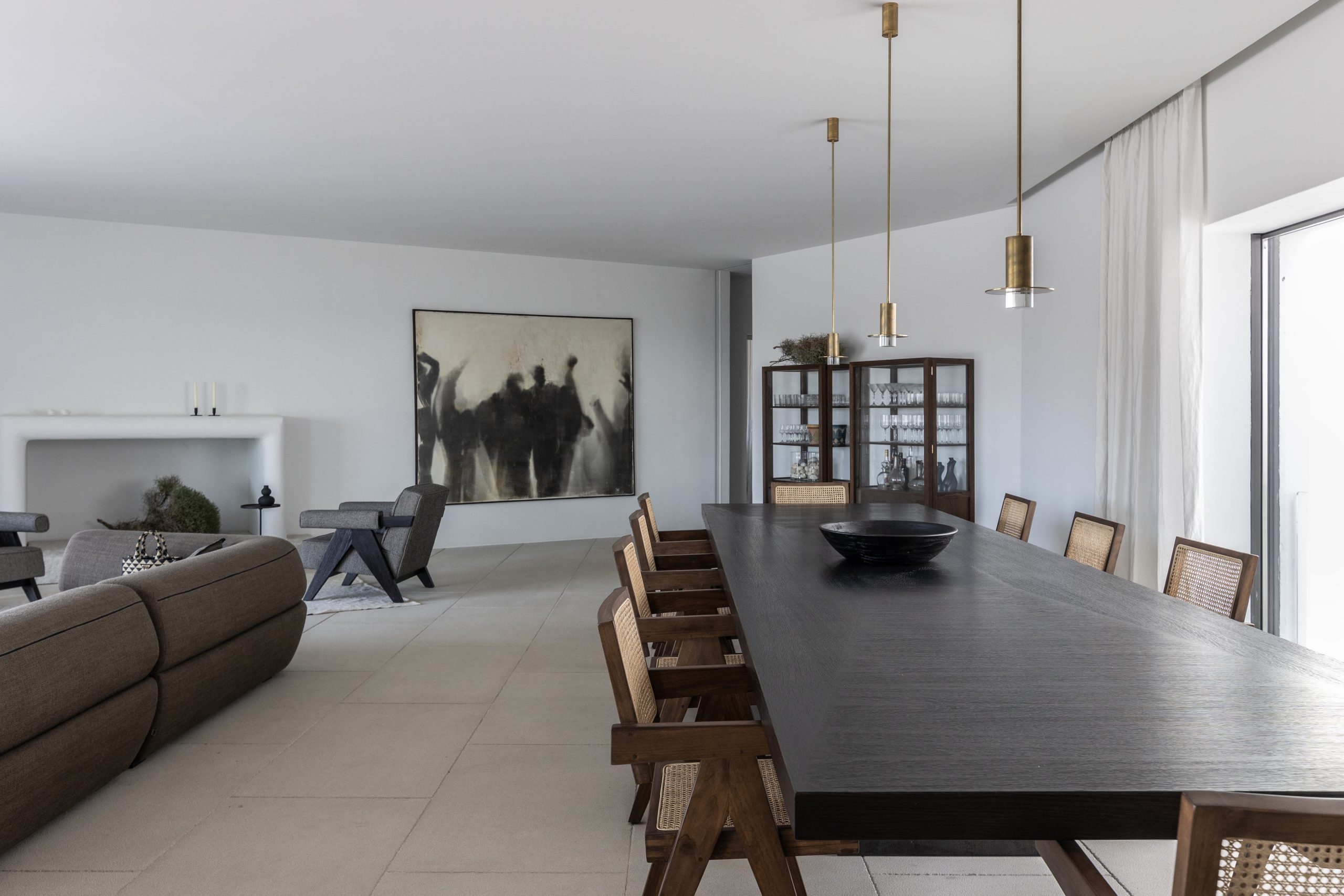 REZ-DE-CHAUSSÉE Espace de vie moderne et ouvert, décoré dans des tons ocres, s’ouvrant sur la terrasse de la piscine avec une vue magnifique sur la mer et le monastère de St Antonios. Grande salle à manger pouvant accueillir confortablement jusqu’à 20 personnes. WC invités Cuisine professionnelle, avec passe-plat donnant sur la terrasse de la piscine.