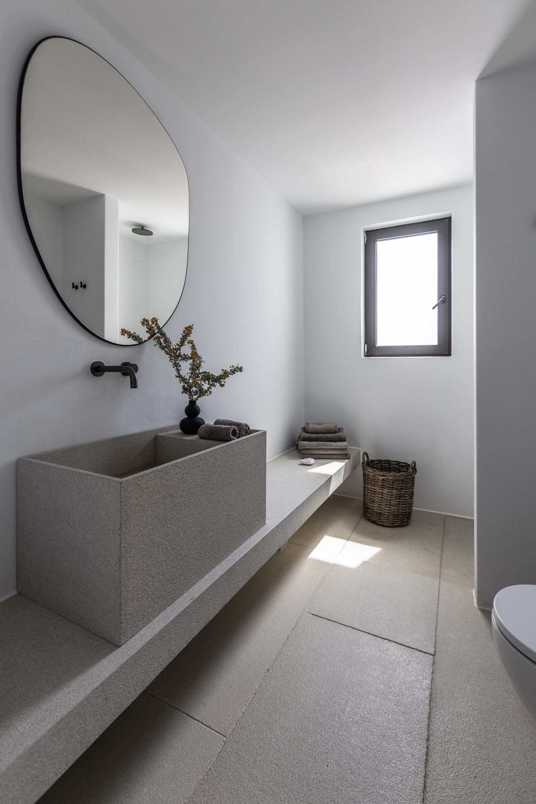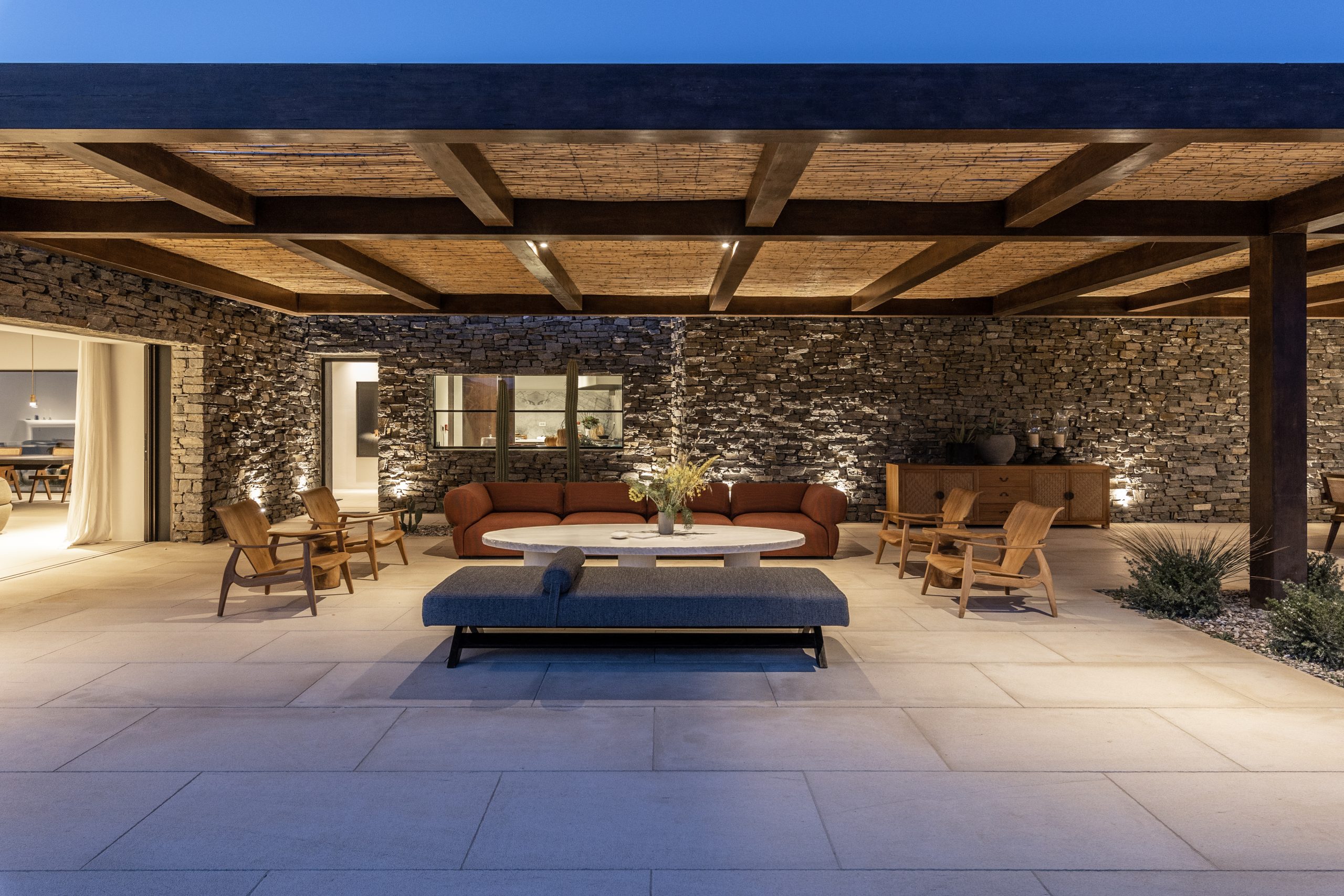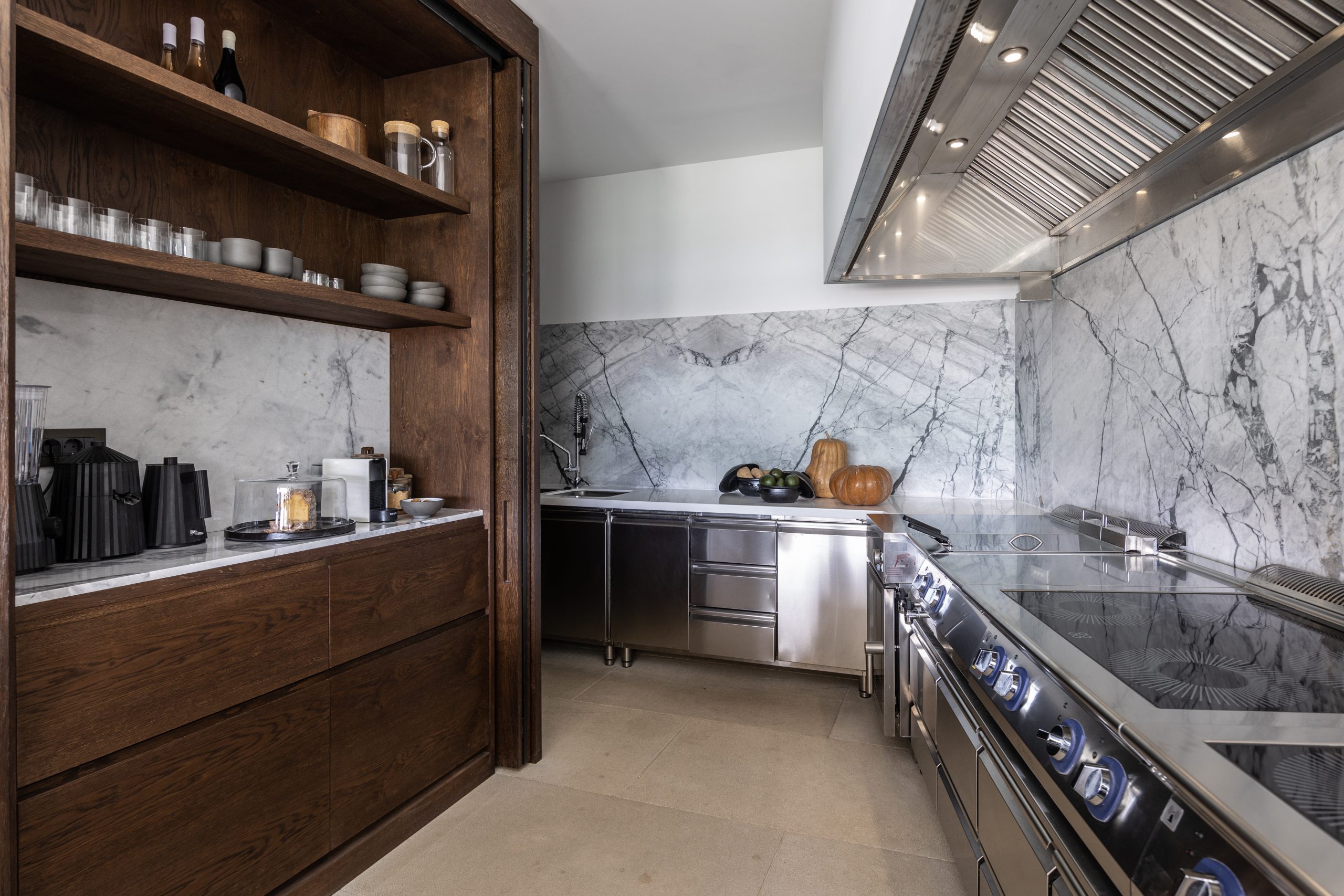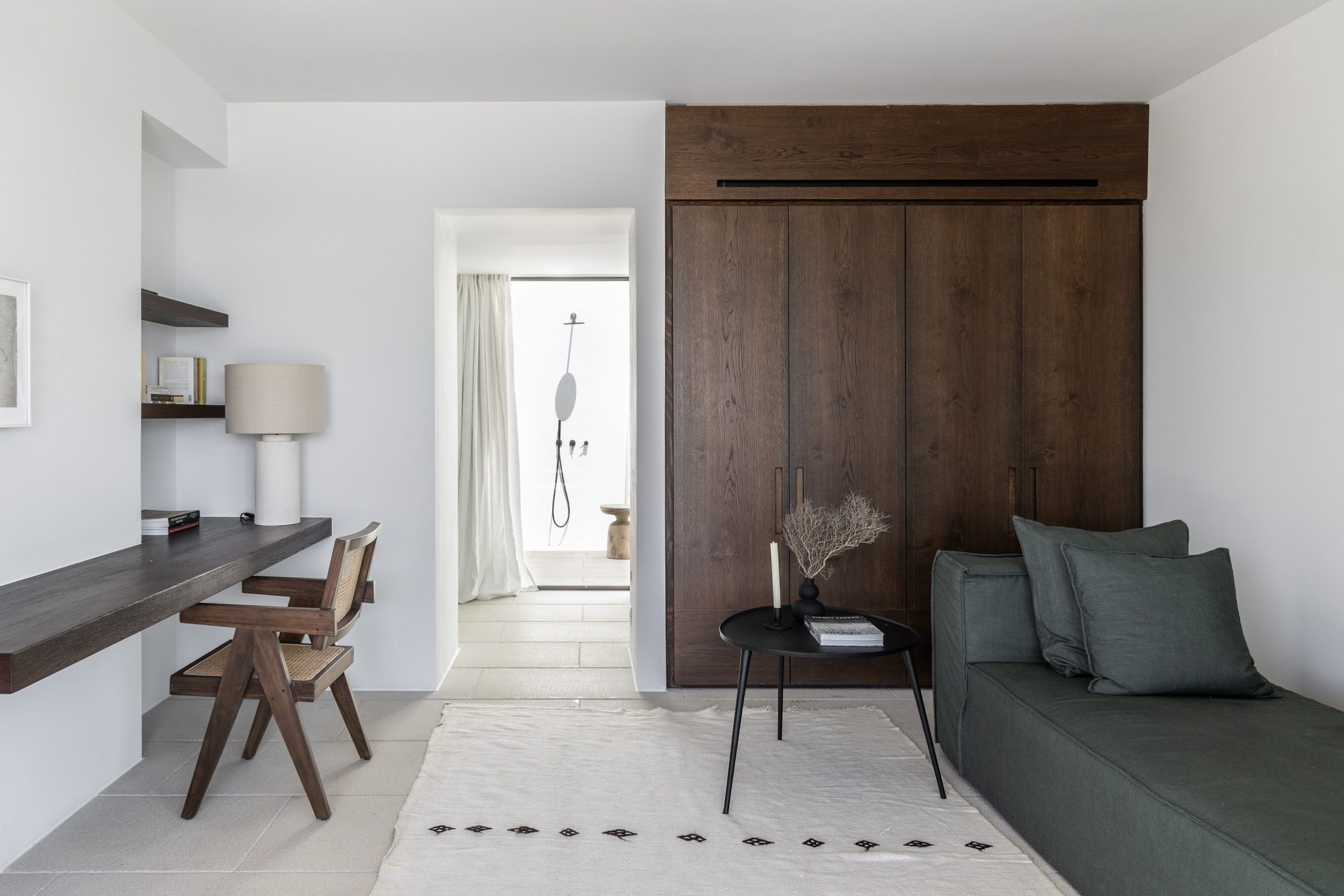 REZ-DE-CHAUSSÉE Espace de vie moderne et ouvert, décoré dans des tons ocres, s’ouvrant sur la terrasse de la piscine avec une vue magnifique sur la mer et le monastère de St Antonios. Grande salle à manger pouvant accueillir confortablement jusqu’à 20 personnes. WC invités Cuisine professionnelle, avec passe-plat donnant sur la terrasse de la piscine.