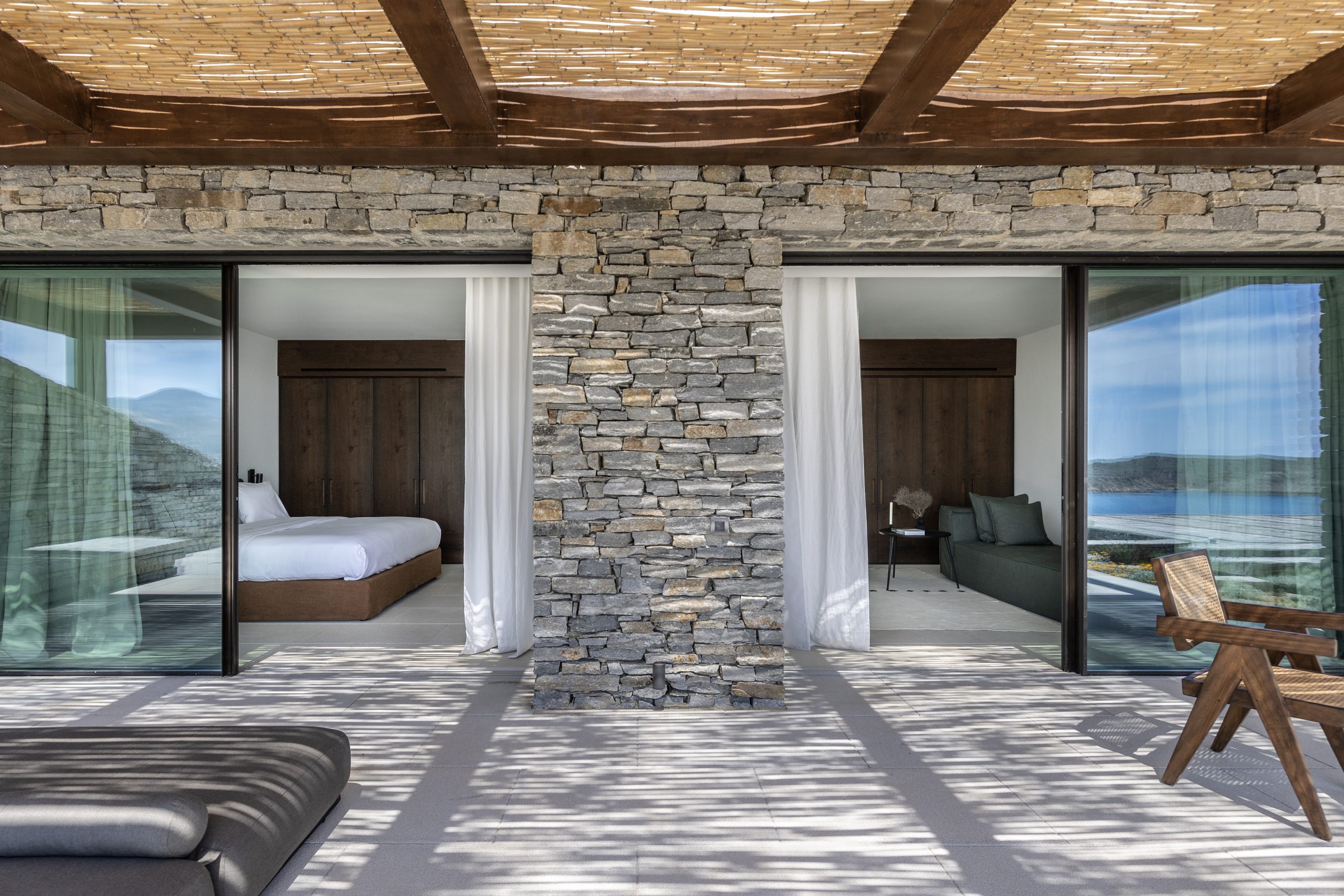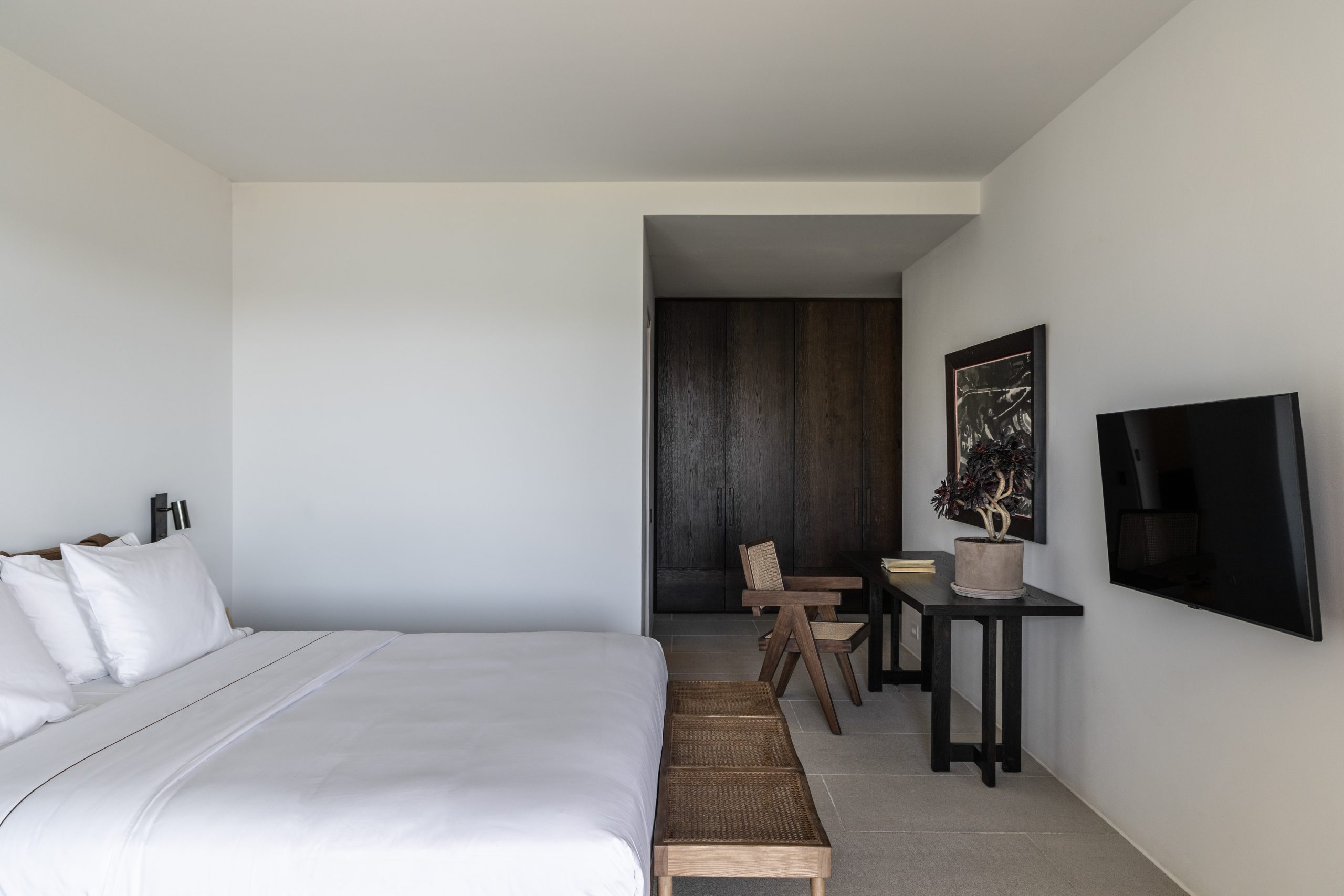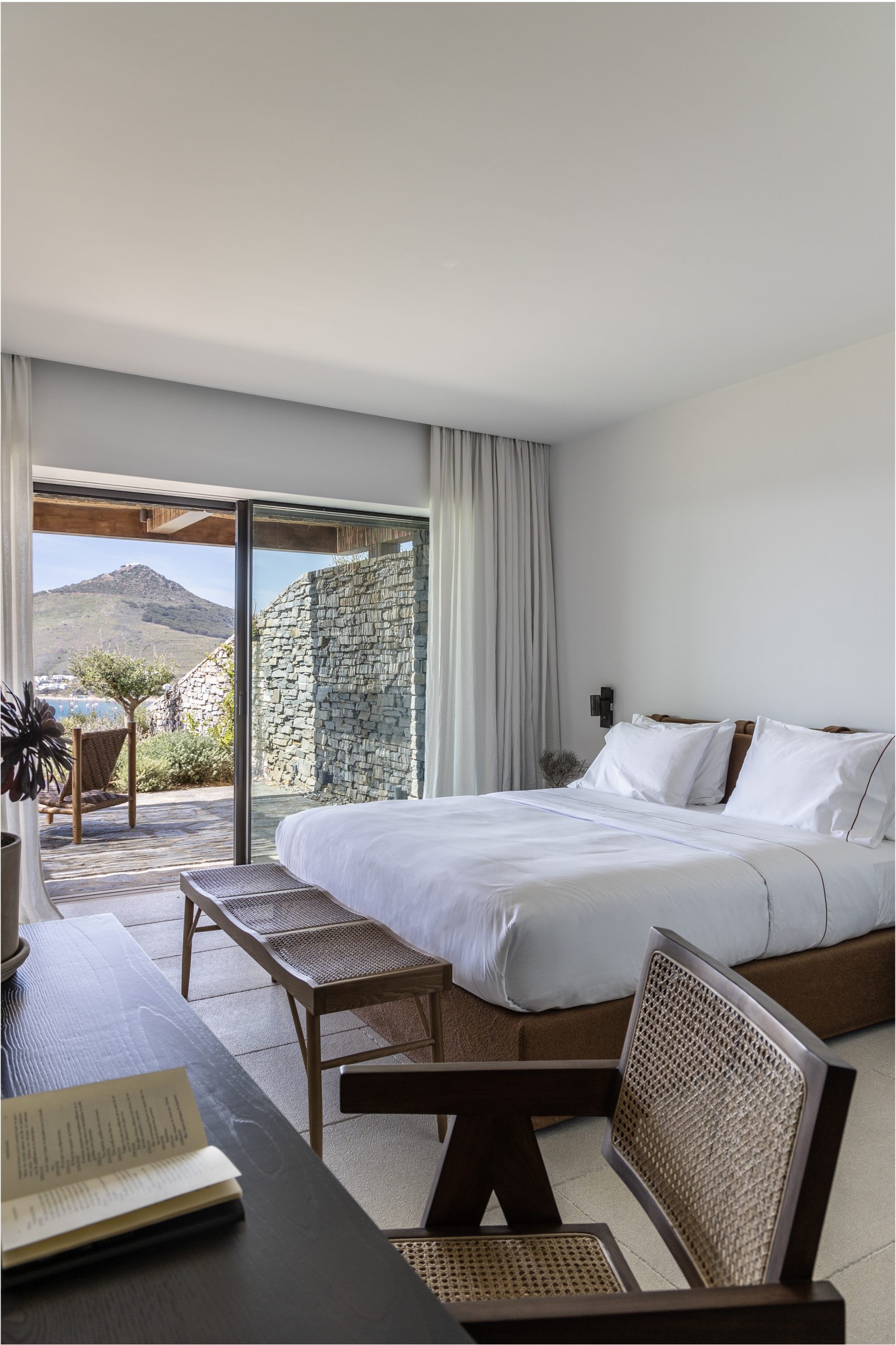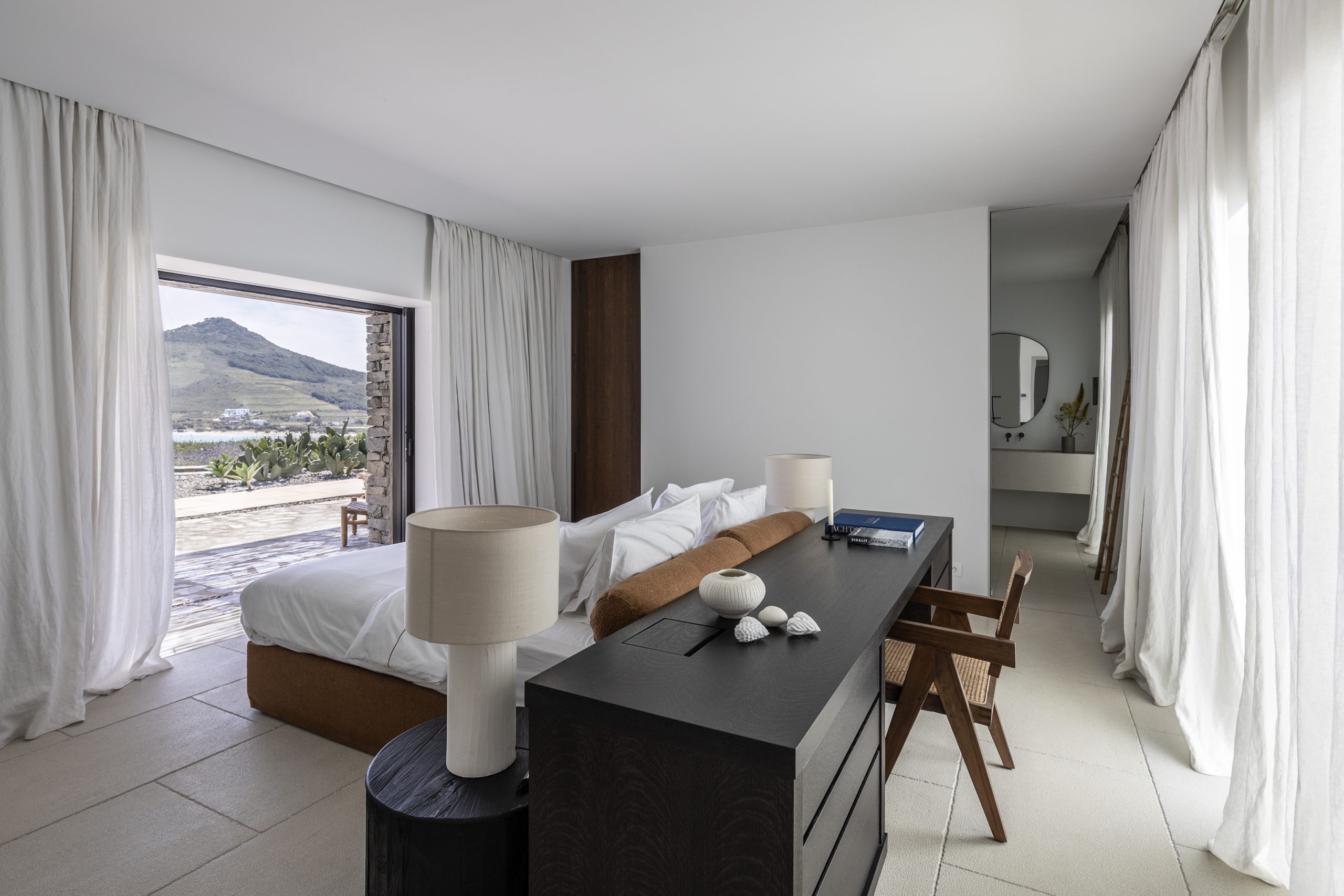 Chambre 1 : chambre principale spacieuse et lumineuse avec lit king size (180 cm), télévision, dressing, salle de douche attenante et douche extérieure, s’ouvrant sur la piscine à l’avant avec terrasse privée et vue sur la mer.