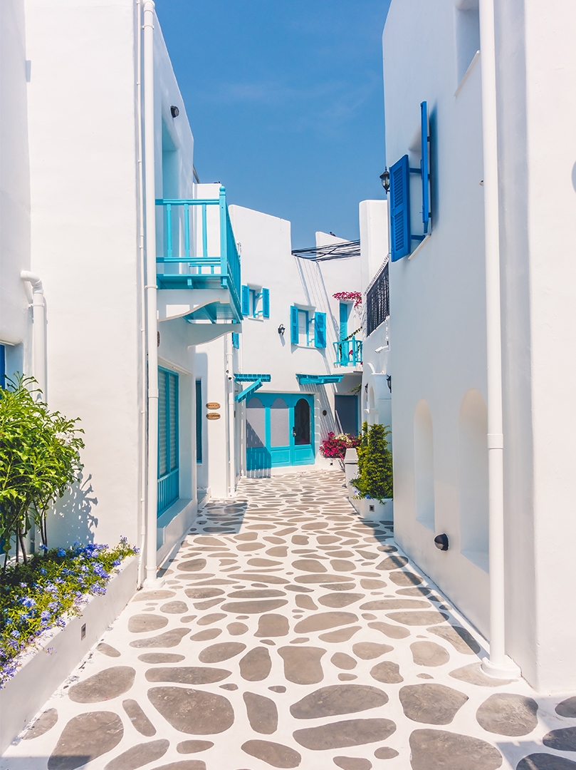 Chora, la capitale de Mykonos, est un exemple emblématique de l’architecture cycladique. Ses ruelles étroites, pavées de pierres blanchies à la chaux, serpentent entre des maisons cubiques aux façades blanches. Portes, volets et balcons en bois, souvent peints en bleu, structurent l’ensemble, tandis que bougainvilliers et géraniums apportent des touches végétales.