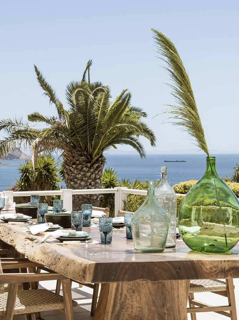 À l’heure la plus lumineuse de la journée, la table se dresse à l’ombre. Le déjeuner célèbre la fraîcheur méditerranéenne. Poisson grillé du jour, simplement arrosé de citron et d’huile d’olive, salade grecque aux tomates charnues et à la feta affinée, légumes rôtis aux herbes sauvages.